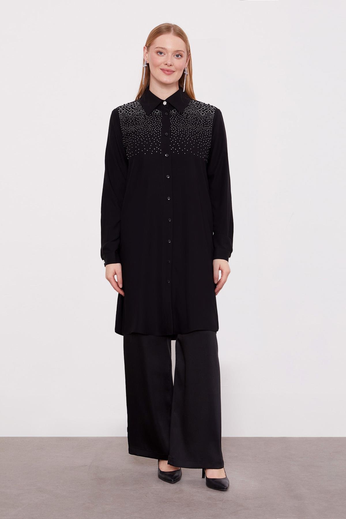 Sedef Düğmeli Modal Tunik Siyah, modern tasarımı ve rahat kalıbıyla yaz sezonunun vazgeçilmez parçalarından biri. %65 viskon, %28 naylon ve %7 liyosel karışımlı kumaşı, yumuşak dokusuyla hafiflik ve nefes alabilirlik sunarken gün boyu konfor sağlar. Bisiklet yaka ve düşük omuz tasarımı, rahat bir siluet oluştururken, brit detayları ve sedef parlaklığındaki düğmeler, tunik formuna zarif bir dokunuş katar.