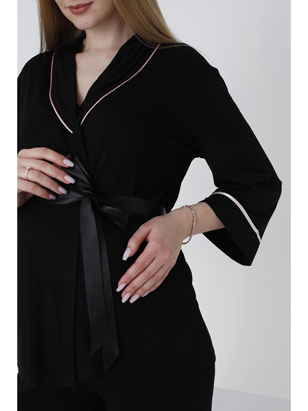 Siyah – Pembe Önden Bağlamalı Geniş Şerit Yakalı Hamile ve Lohusa Pijama Takımı