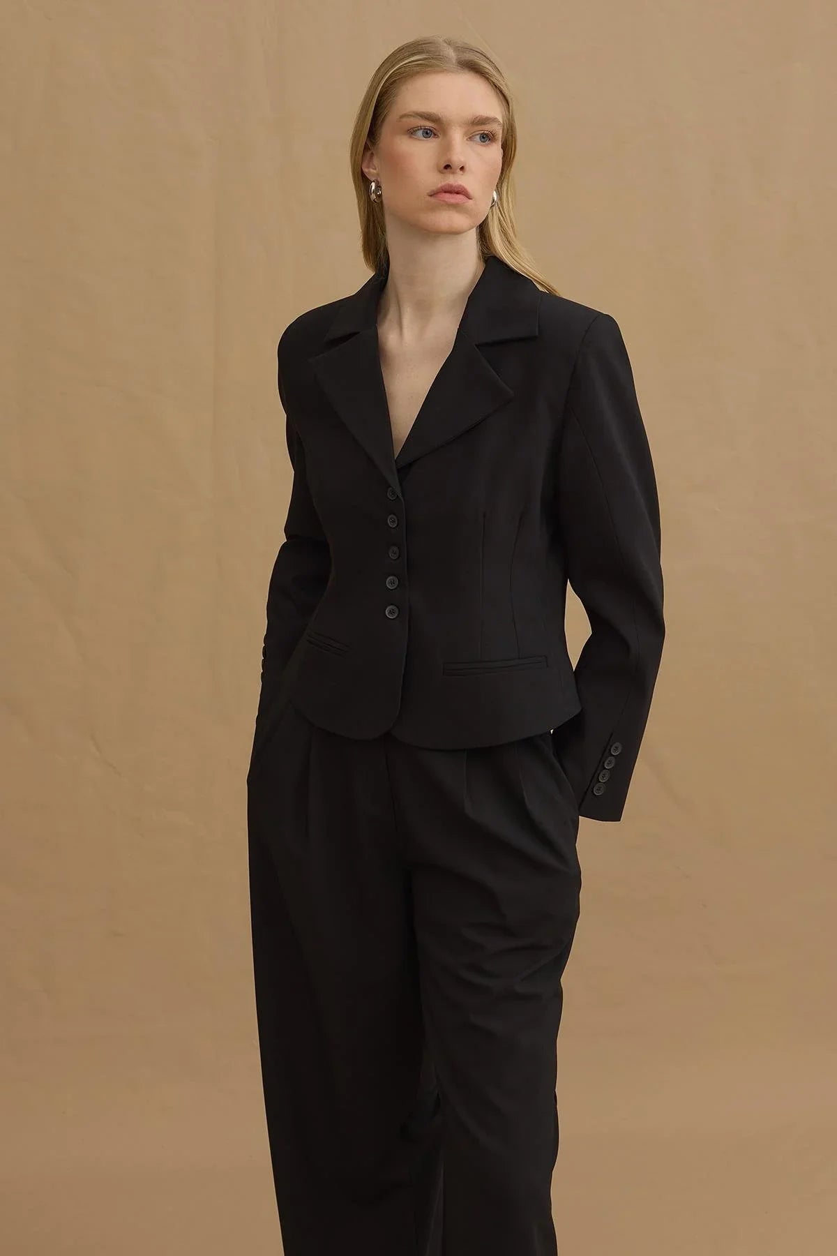 İnce poliviskon kumaştan üretilmiş bu ceket, yaka yakalı, tek düğmeli ön kısım ve pilili detaylarla vücuda oturan bir yapıya sahiptir.