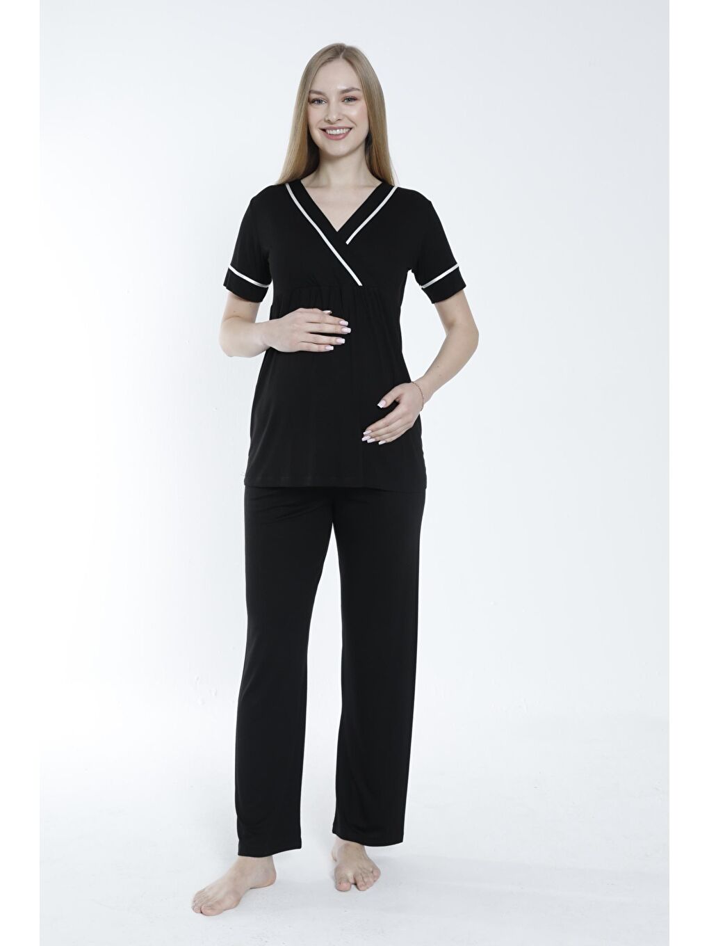 Siyah Sabahlıklı Şerit Detaylı Hamile ve Lohusa Pijama Takımı