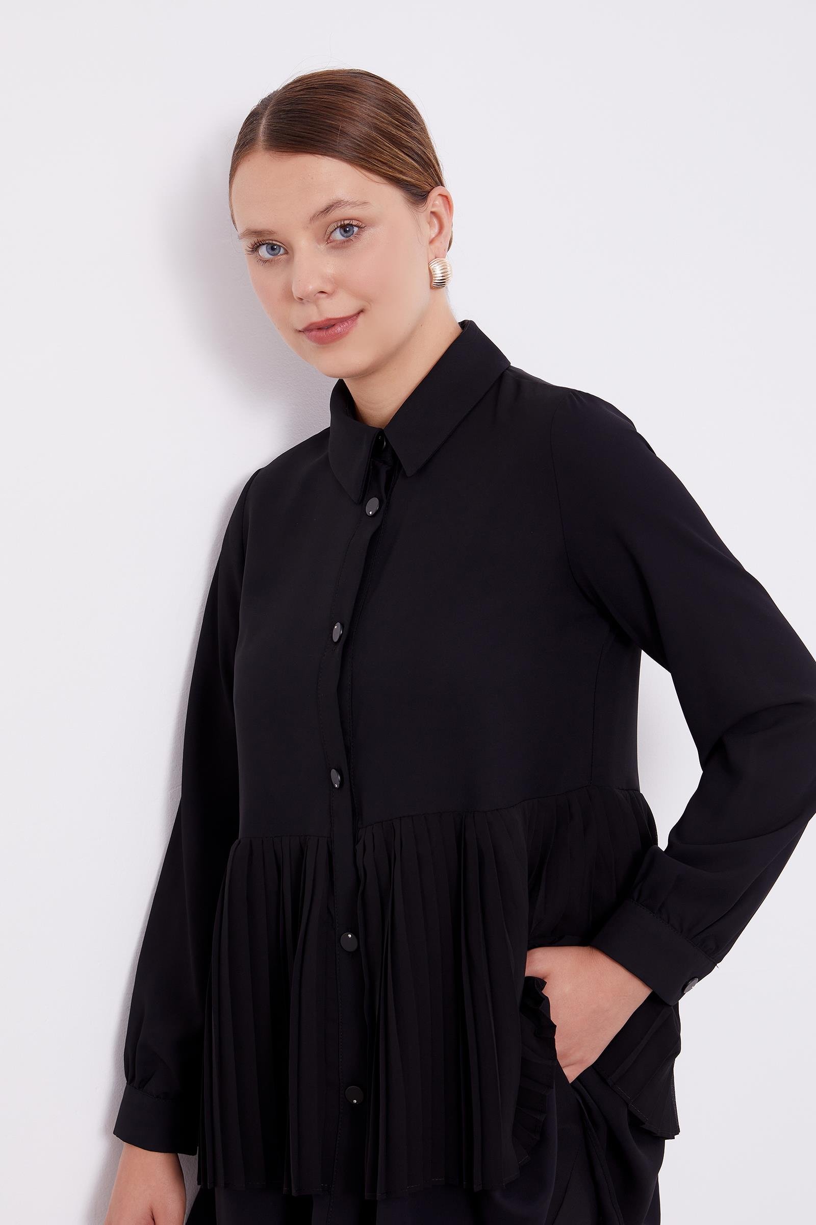 Siyah Şifon Pileli Gömlek İkili Takım