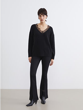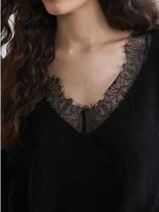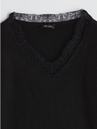 Siyah V Yaka Dantel Detaylı Oversize Kadın Triko Kazak