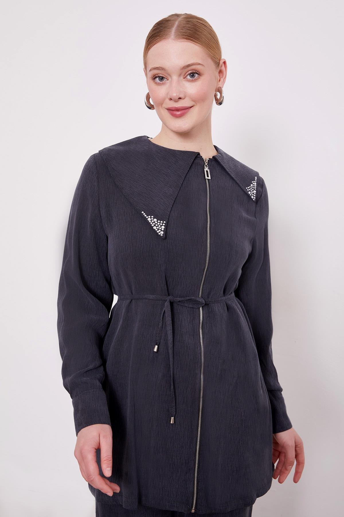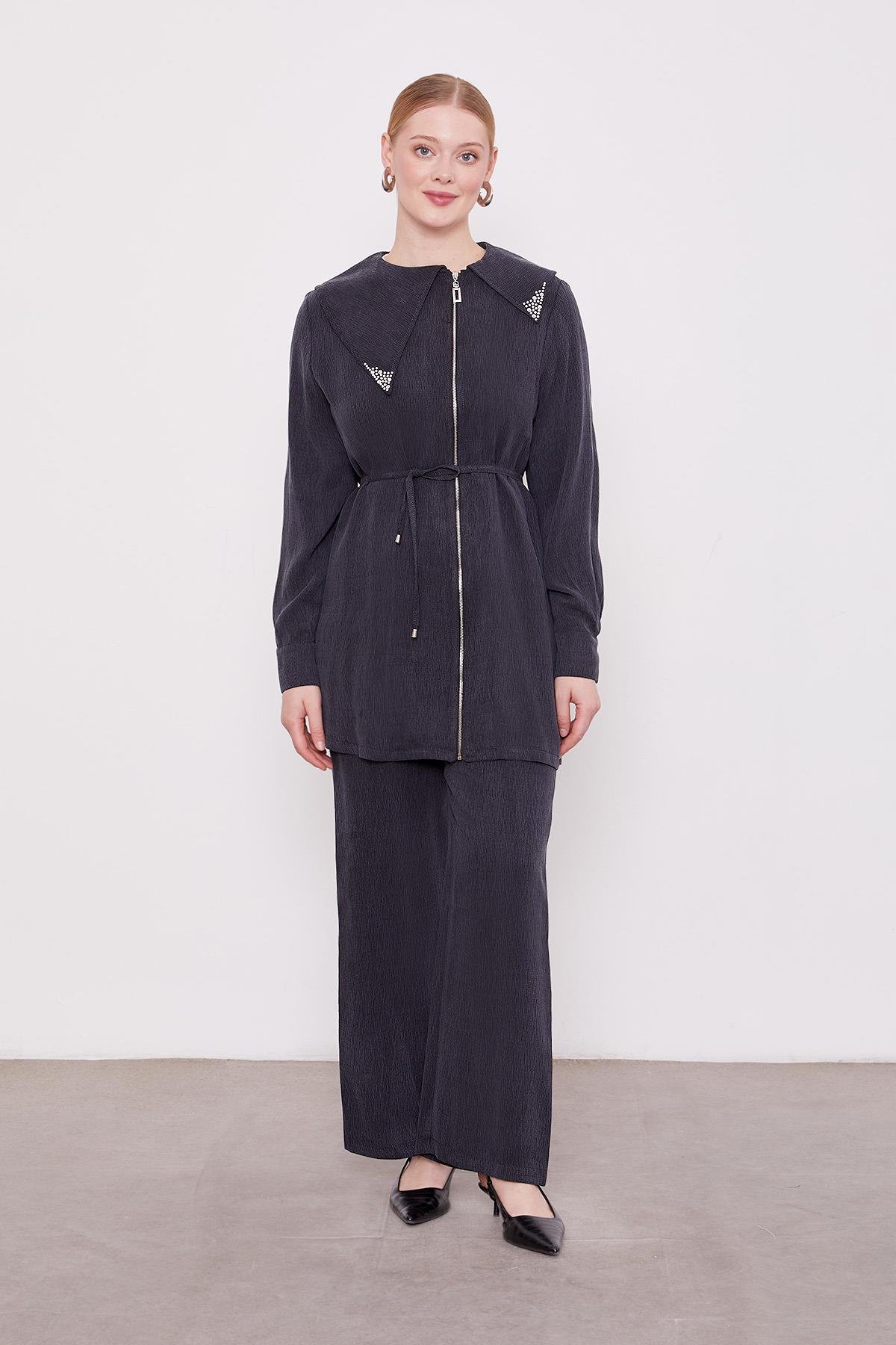 Tunik ve pantolonun uyumlu siluetiyle öne çıkan bu takım, aplike cep detaylarıyla sade tasarıma sofistike bir karakter kazandırır. Akıcı kumaşı gün boyu konfor sağlarken, modern çizgisi şehir stiline güçlü ama yalın bir dokunuş ekler.