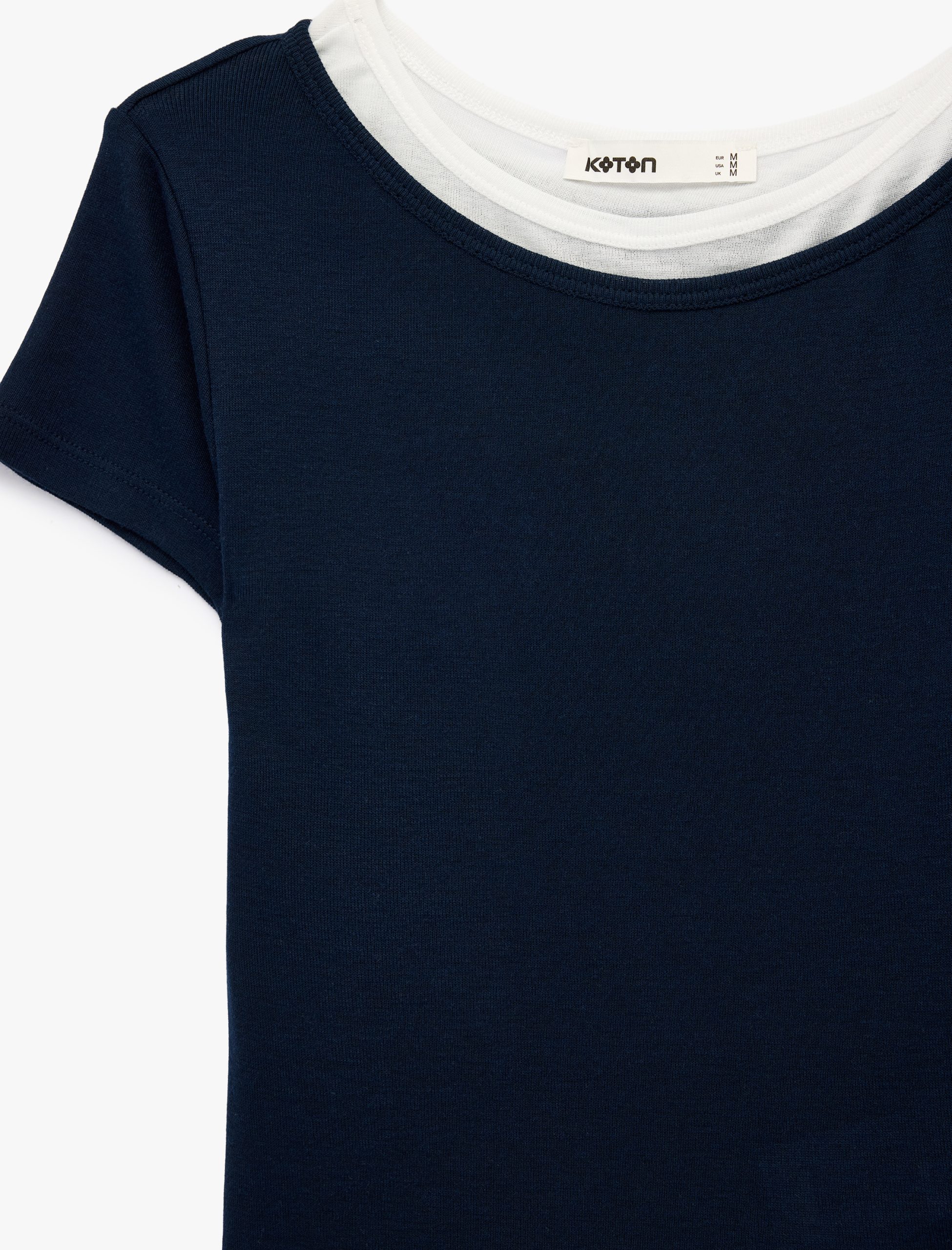 Slim Fit Kontrast Detaylı Kısa Kollu Kayık Yaka Tişört