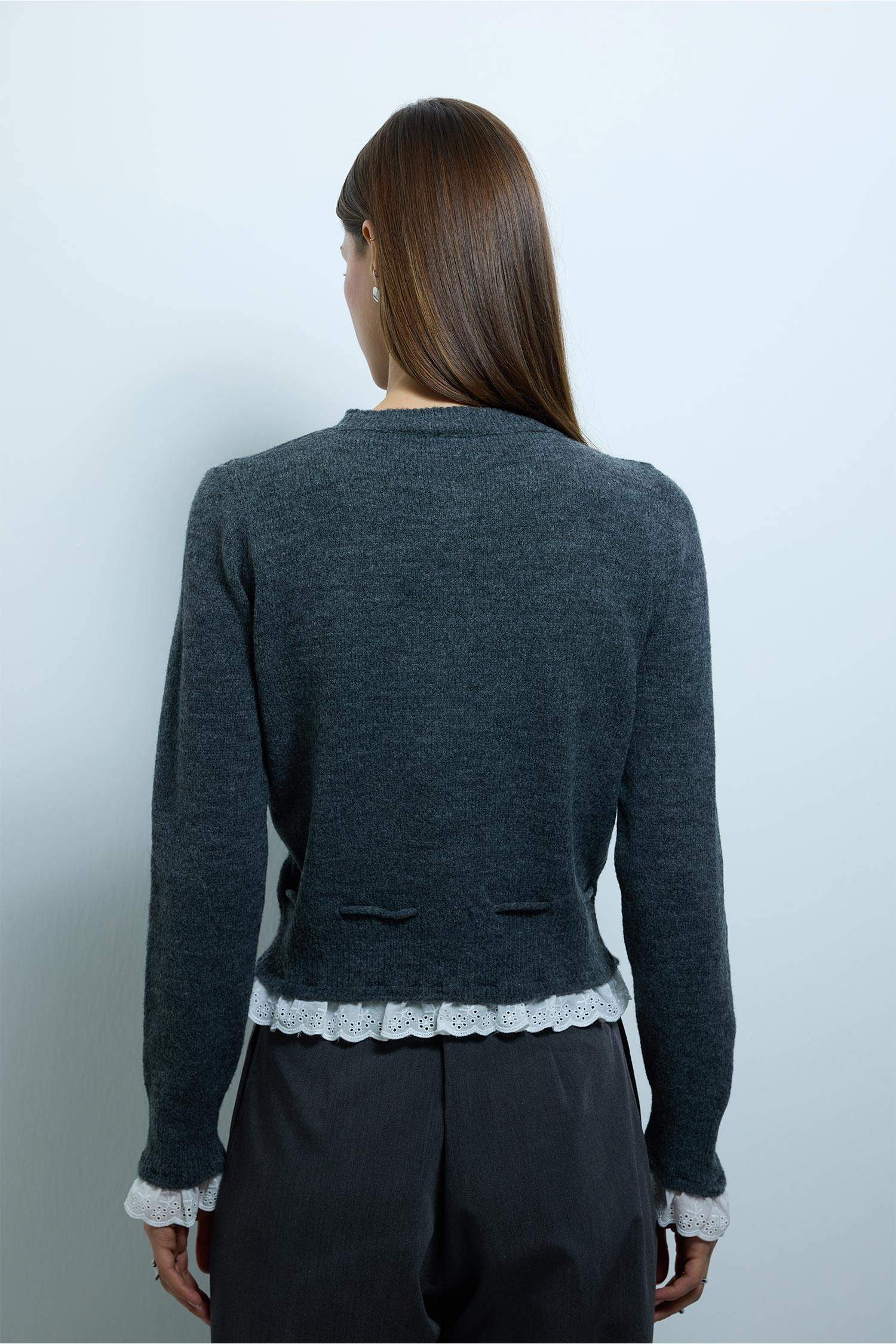 Slim fit dar kesim bağlama detaylı hırka, vücuda oturan formu ve şık bağlama detayıyla zarif bir görünüm sunar. Yumuşak dokusu sayesinde gün boyu konfor sağlarken kombinlere modern bir dokunuş katar.