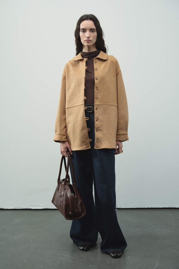 Birit kapama düğmeli, rahat kalıp, yumuşak dokulu özel tasarım süet gömlek.