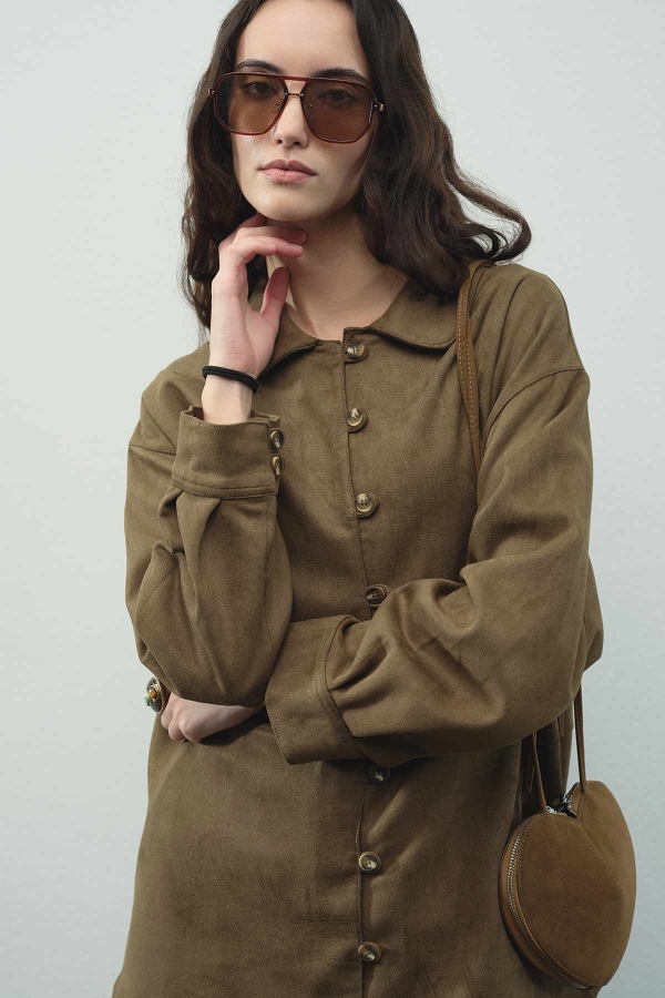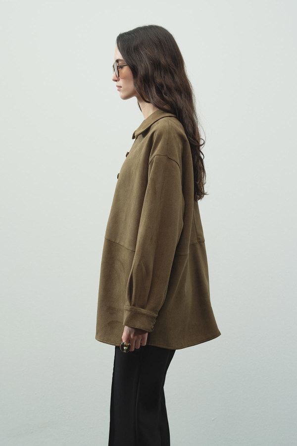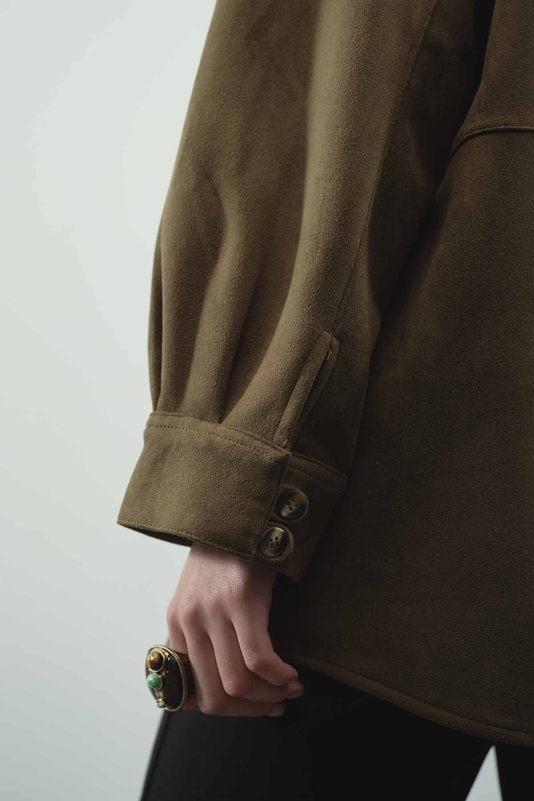 Suede Birit Detaylı Haki Süet Gömlek