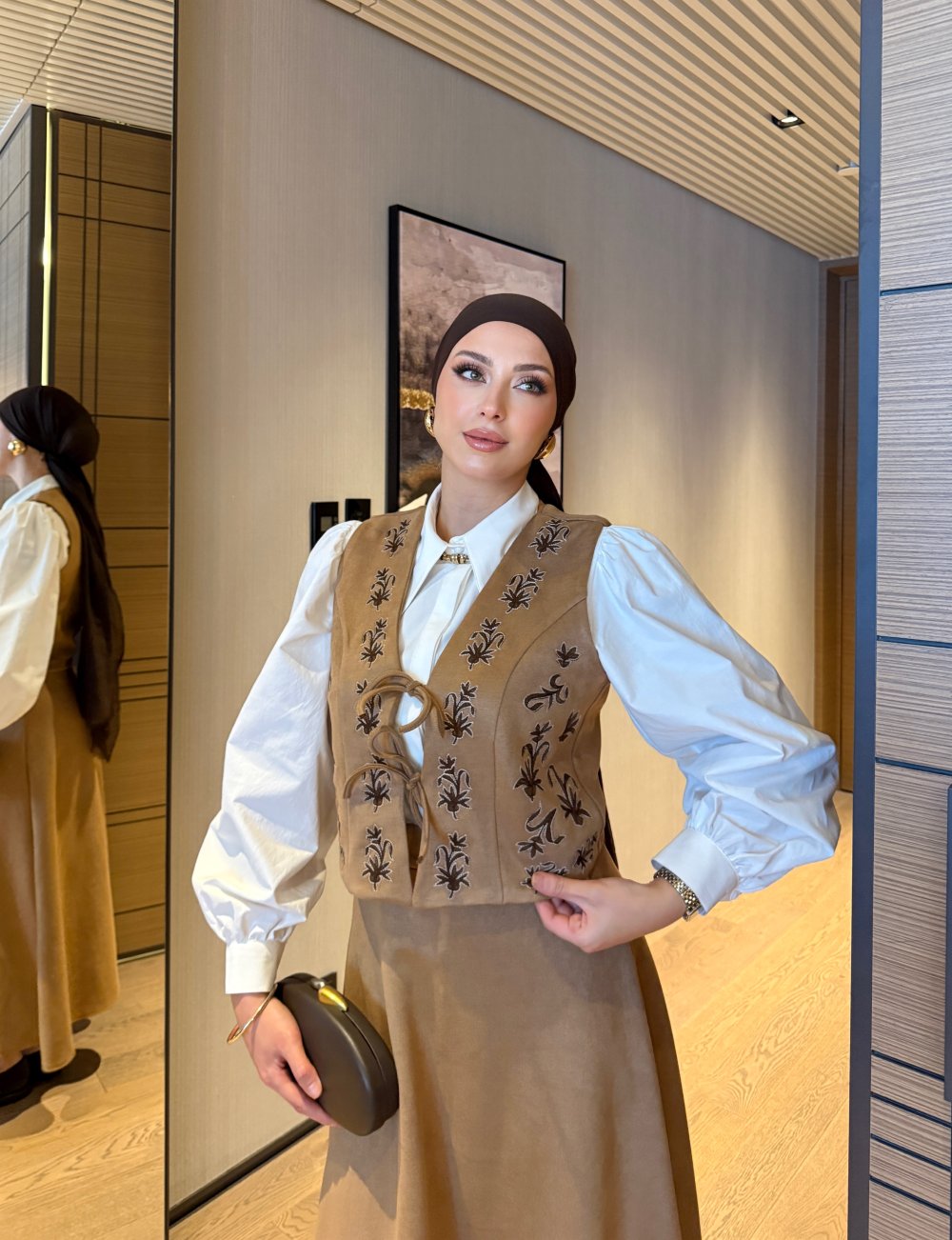 Bu etek takımı birinci sınıf süet kumaştan üretilmiştir. Yelek, detaylı nakış işlemeleri ve ön bağlama kapatması ile dikkat çeker. Etek, mükemmel uyum için arka fermuarlıdır. Yelek Uzunluğu: 47cm, Omuz: 34cm, Göğüs: 48cm. Etek Uzunluğu: 93cm, Bel: 36cm.