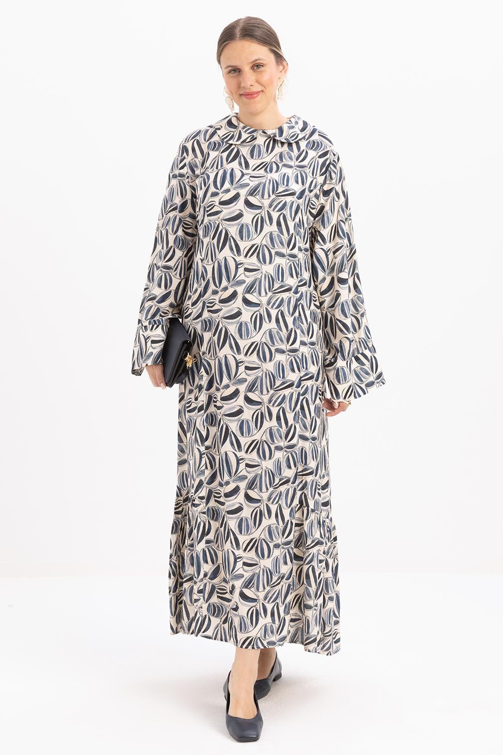 Taş-Mavi-Robalı Kuşaklı Emprime Büyük Beden Elbise