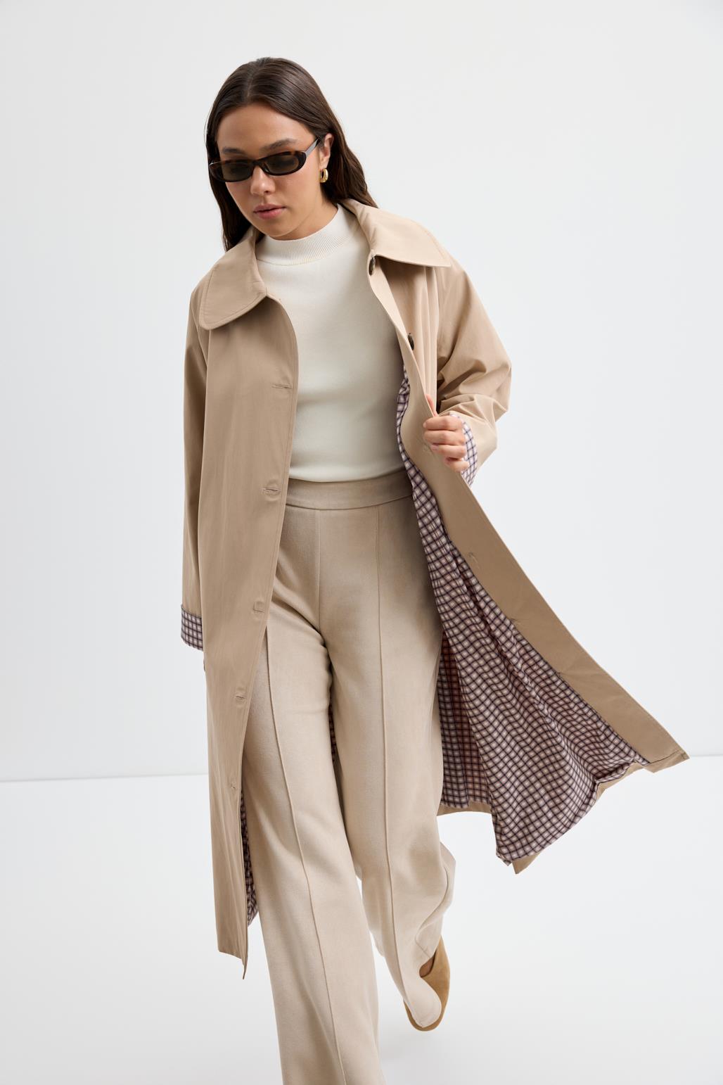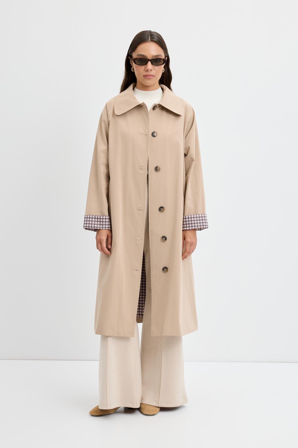 Taş Rengi, Ekose Astarlı, Kemerli Uzun Trençkot