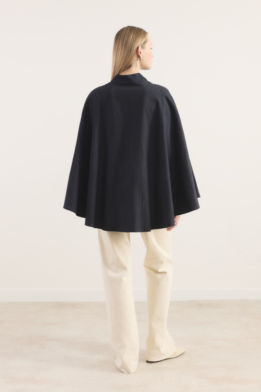 Modern denim dokusu ve göz alıcı detaylarıyla öne çıkan bu panço, stiline iddialı bir dokunuş katıyor. Taş süsleme detayları ürüne ışıltılı bir görünüm kazandırırken, kaplama kemeri bel hattını vurgulayarak şık bir siluet oluşturur. Yaka kısmında yer alan kaplama düğme detayı tasarımı tamamlayıcı bir unsur olarak öne çıkar. Hem günlük kombinlerde hem de özel stil denemelerinde rahatlıkla tercih edilebilir.