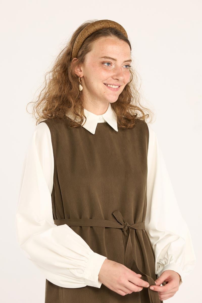 Kemerli Keten Elbise Haki