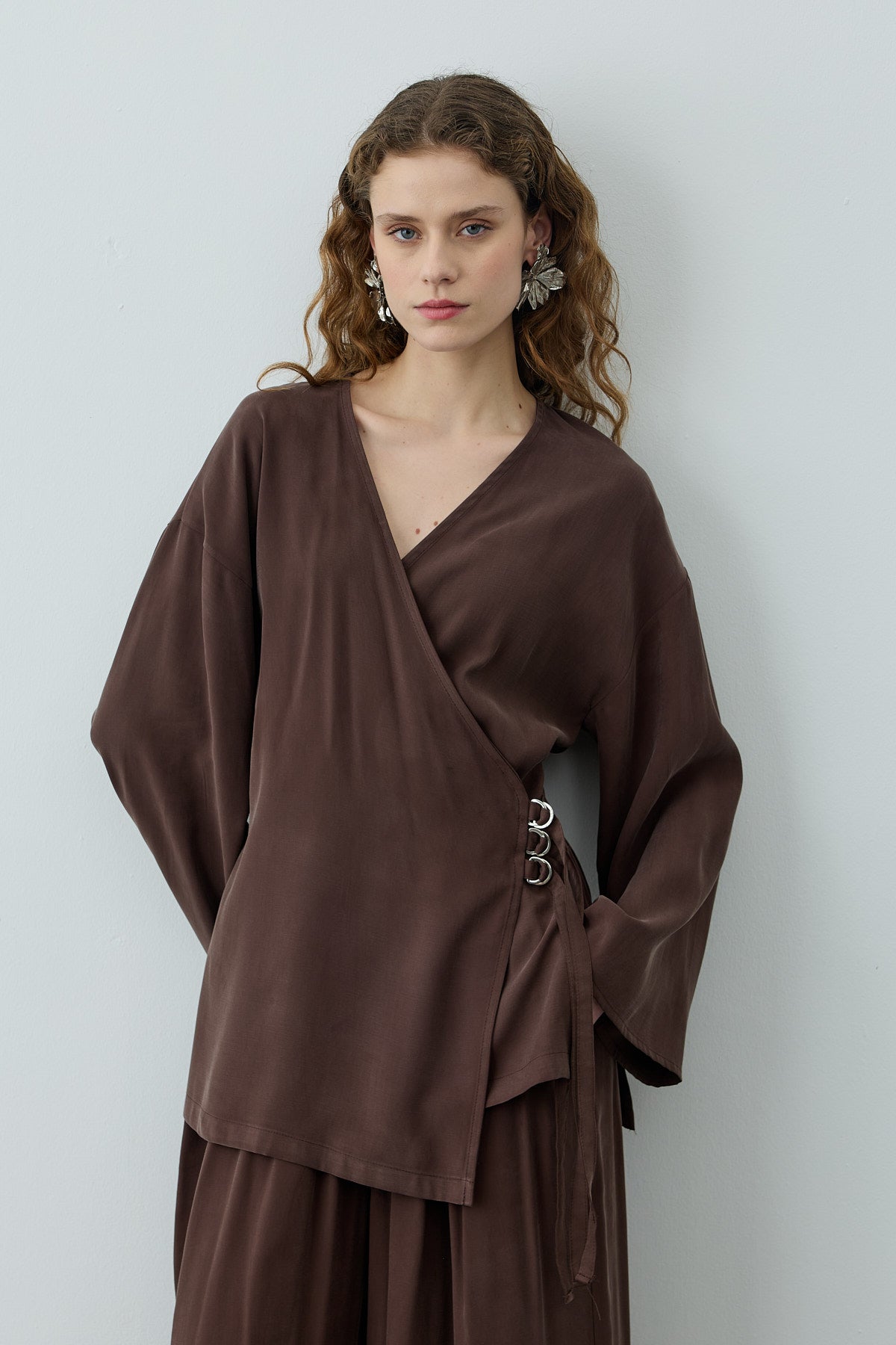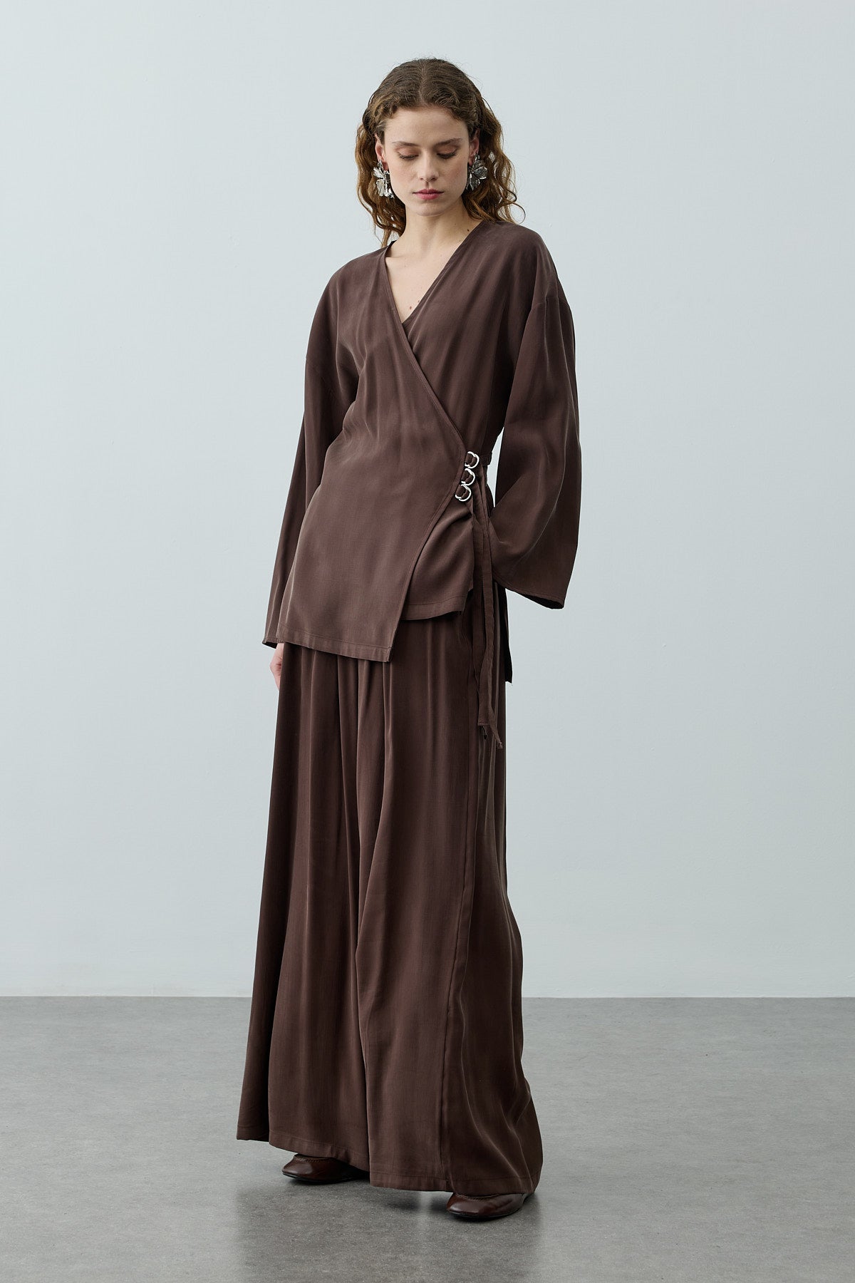 Tensel dokuma kumaştan, kimono kesim, üç brit kemerli, metal tokalı, geniş kimono kollu kimono ve beli lastikli, cepli, geniş kesimli pantolonlu takım.