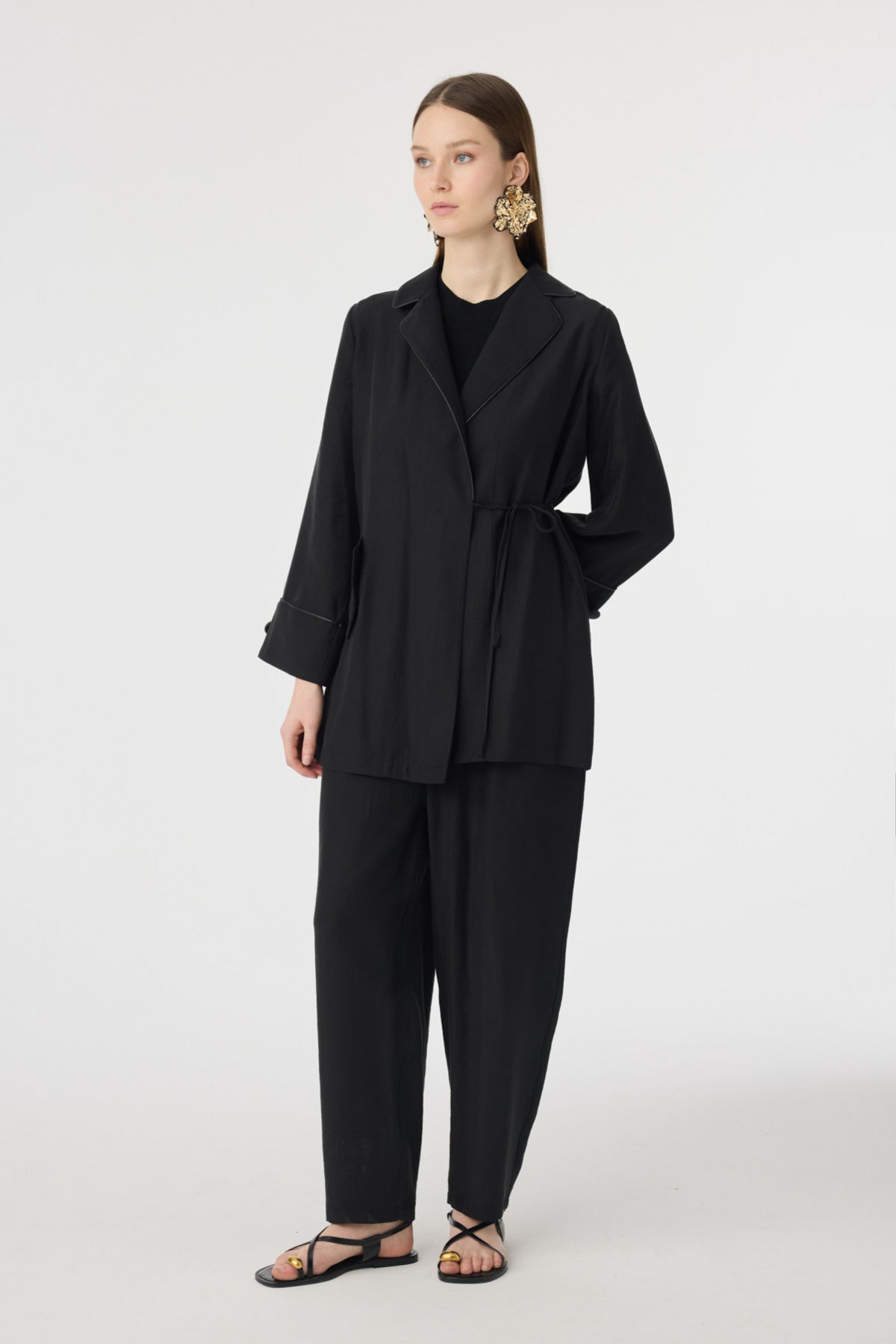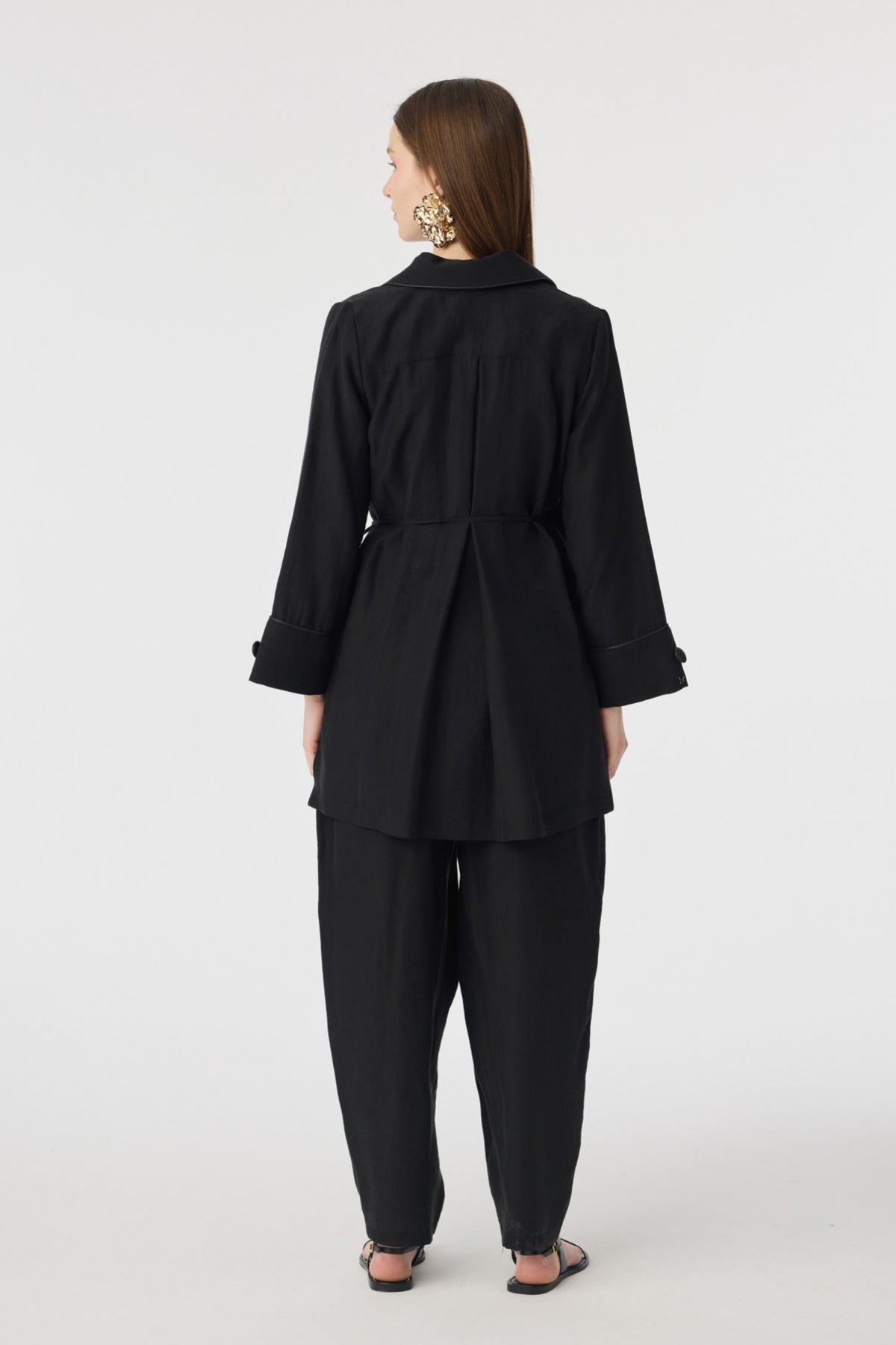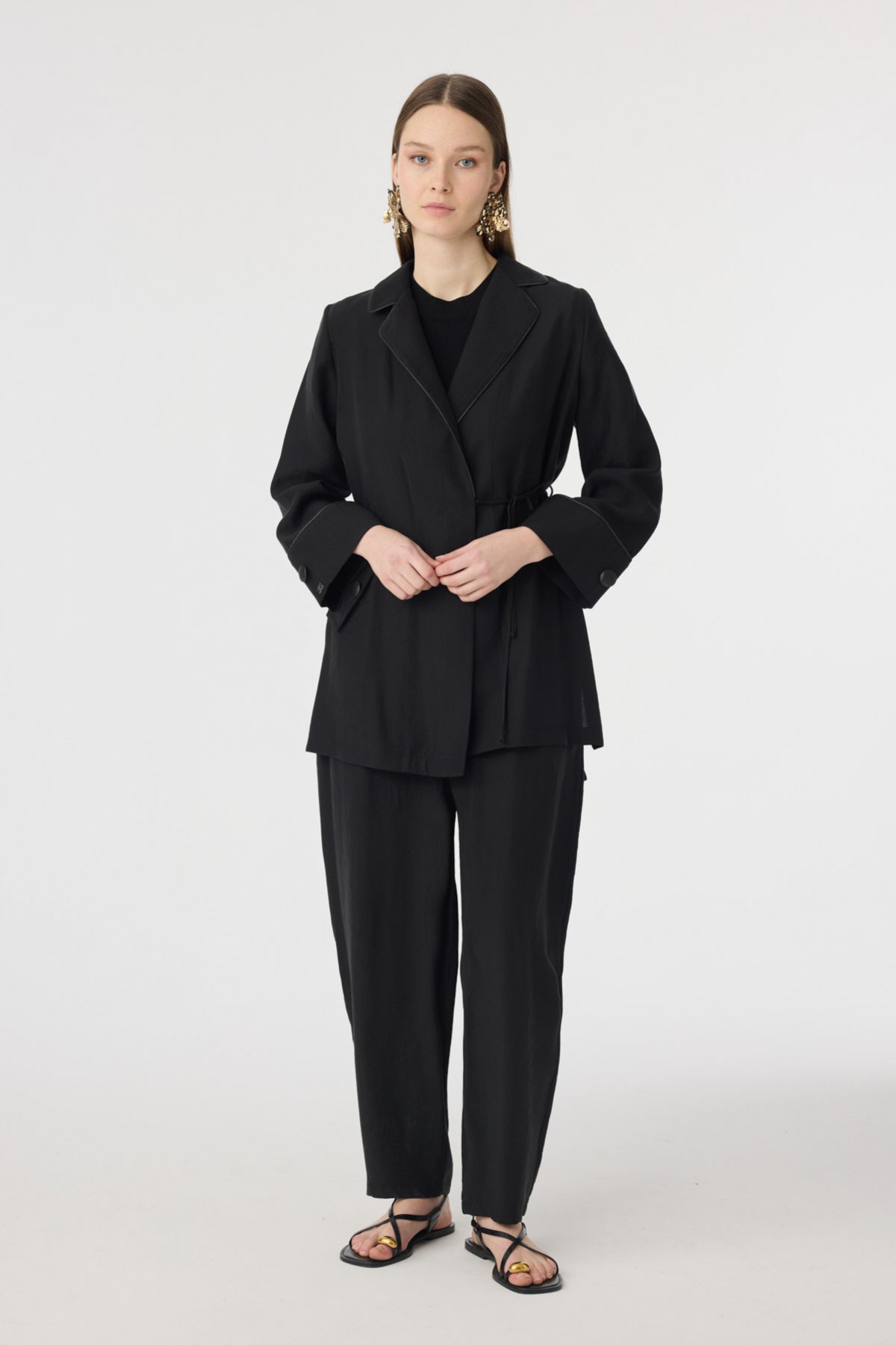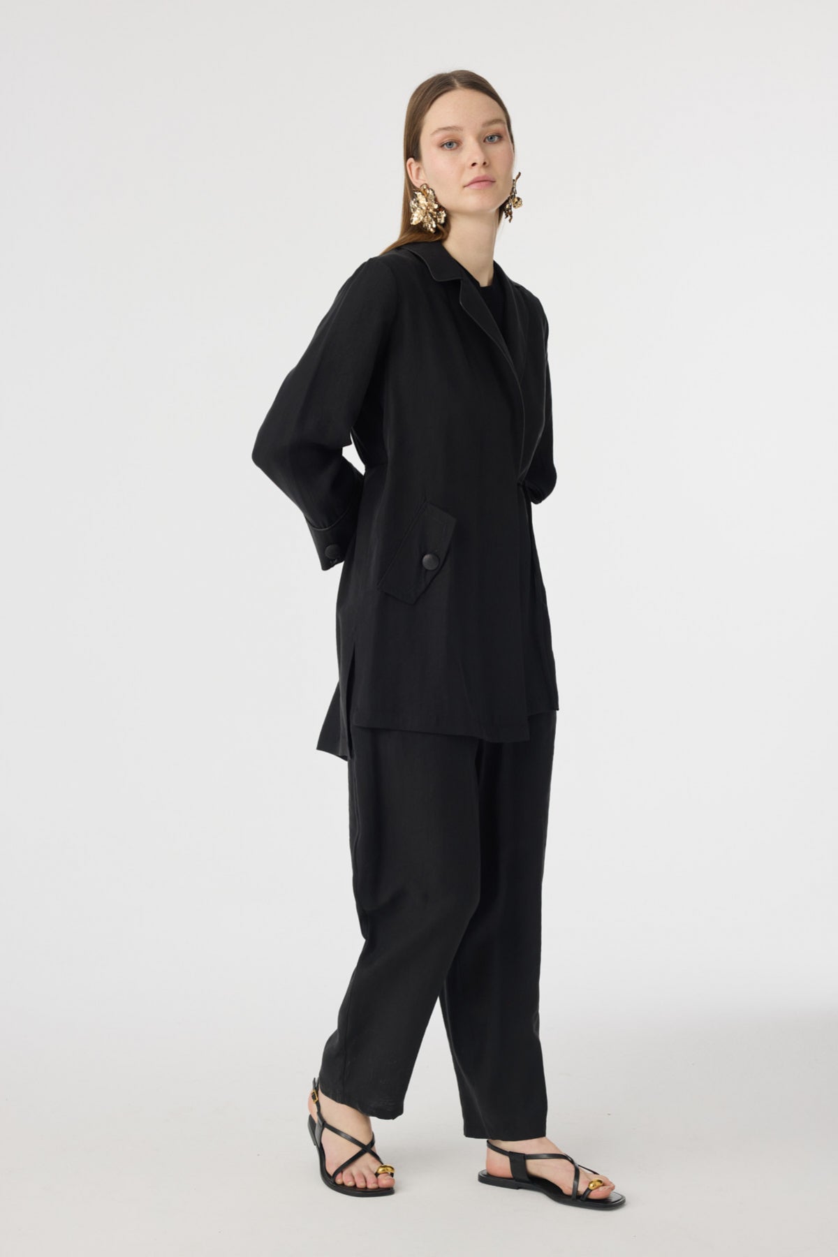 Tunik ve pantolonun uyumlu siluetiyle öne çıkan bu takım, aplike cep detaylarıyla sade tasarıma sofistike bir karakter kazandırır. Akıcı kumaşı gün boyu konfor sağlarken, modern çizgisi şehir stiline güçlü ama yalın bir dokunuş ekler.
