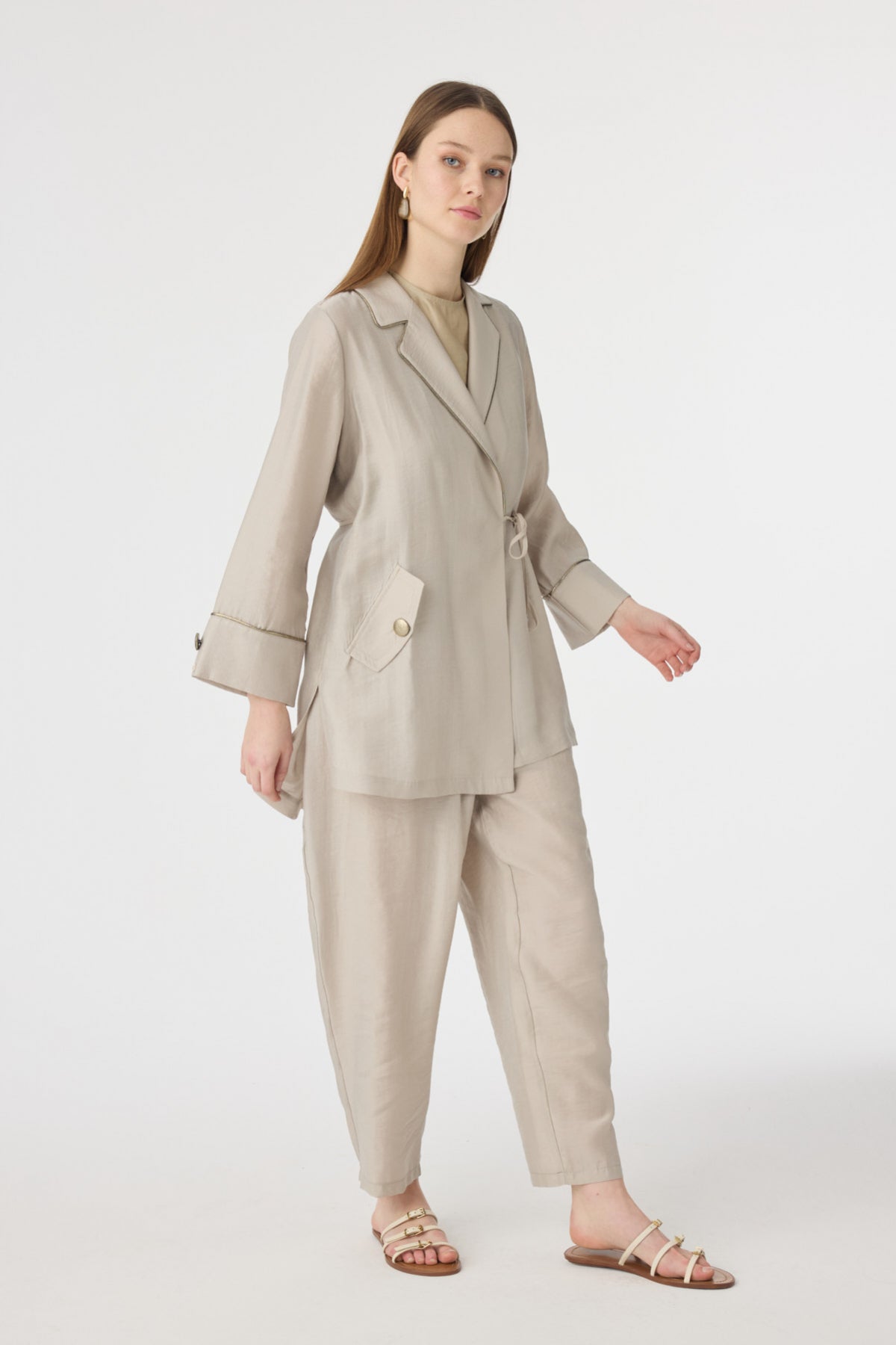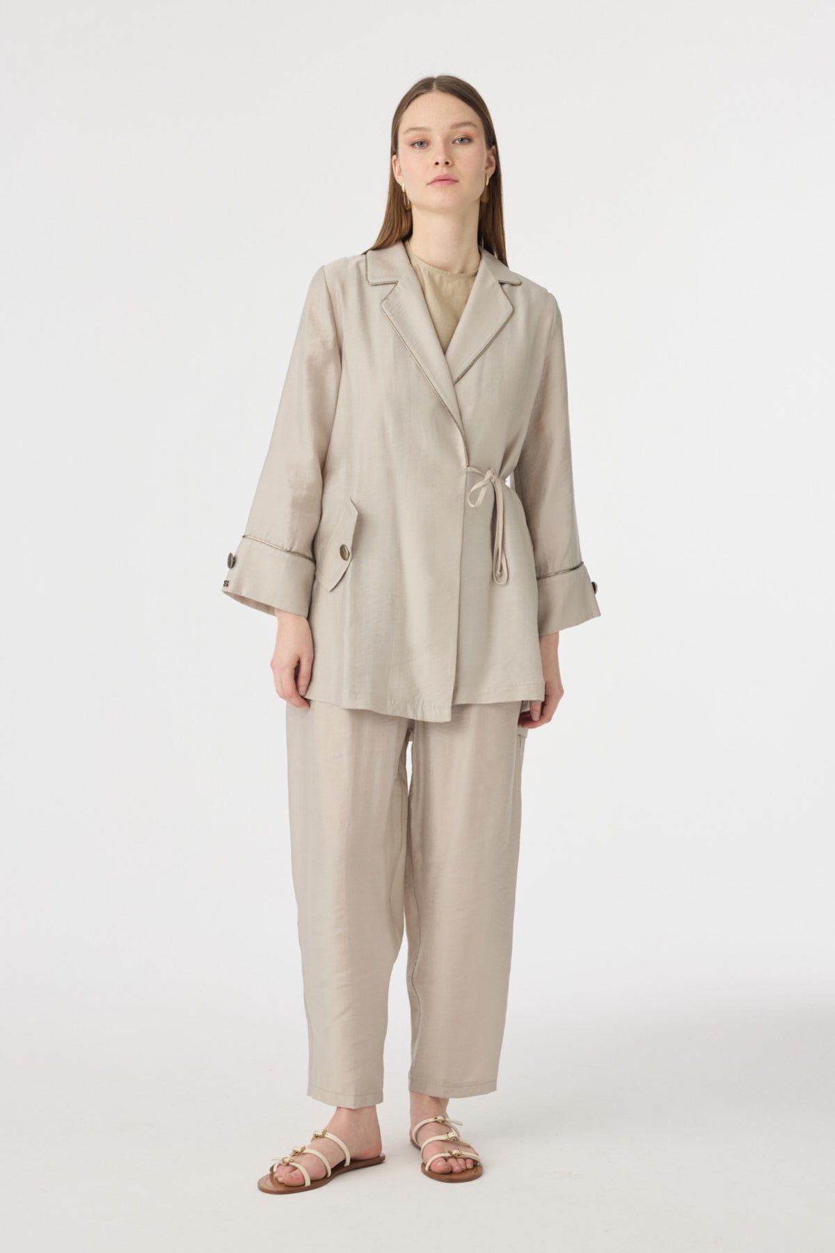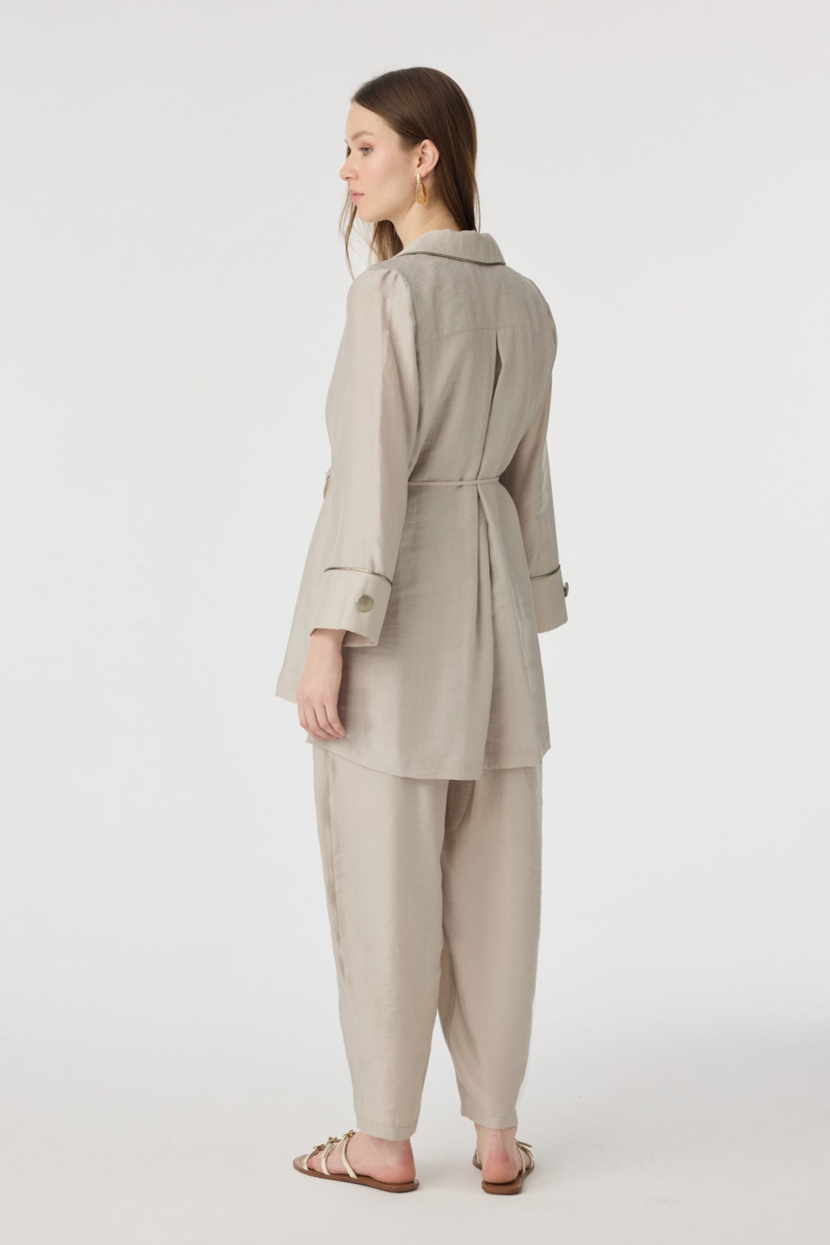 Tunik ve pantolonun uyumlu siluetiyle öne çıkan bu takım, aplike cep detaylarıyla sade tasarıma sofistike bir karakter kazandırır. Akıcı kumaşı gün boyu konfor sağlarken, modern çizgisi şehir stiline güçlü ama yalın bir dokunuş ekler.