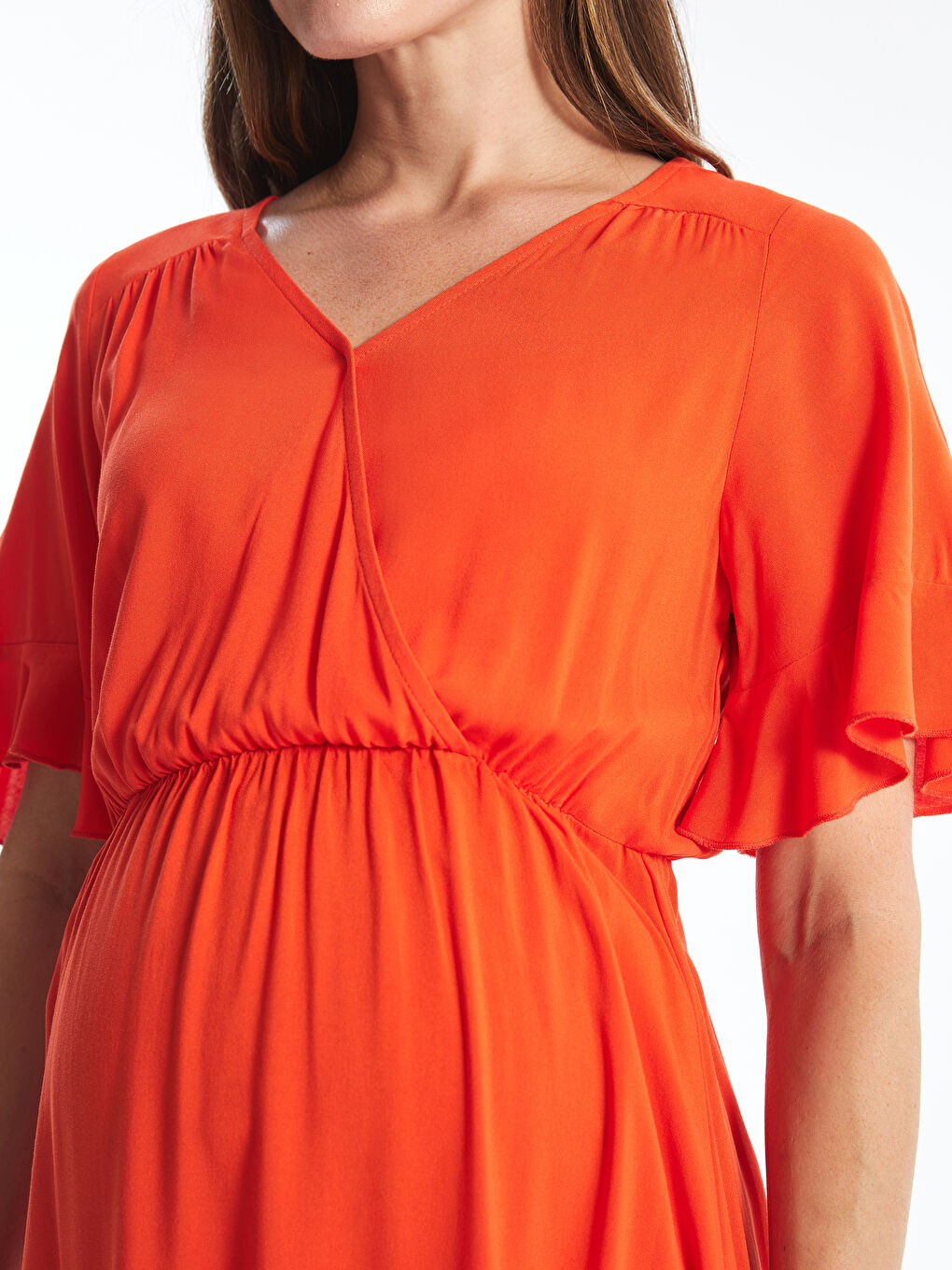 Turuncu Kruvaze Yaka Düz Kısa Kollu Hamile Elbise
