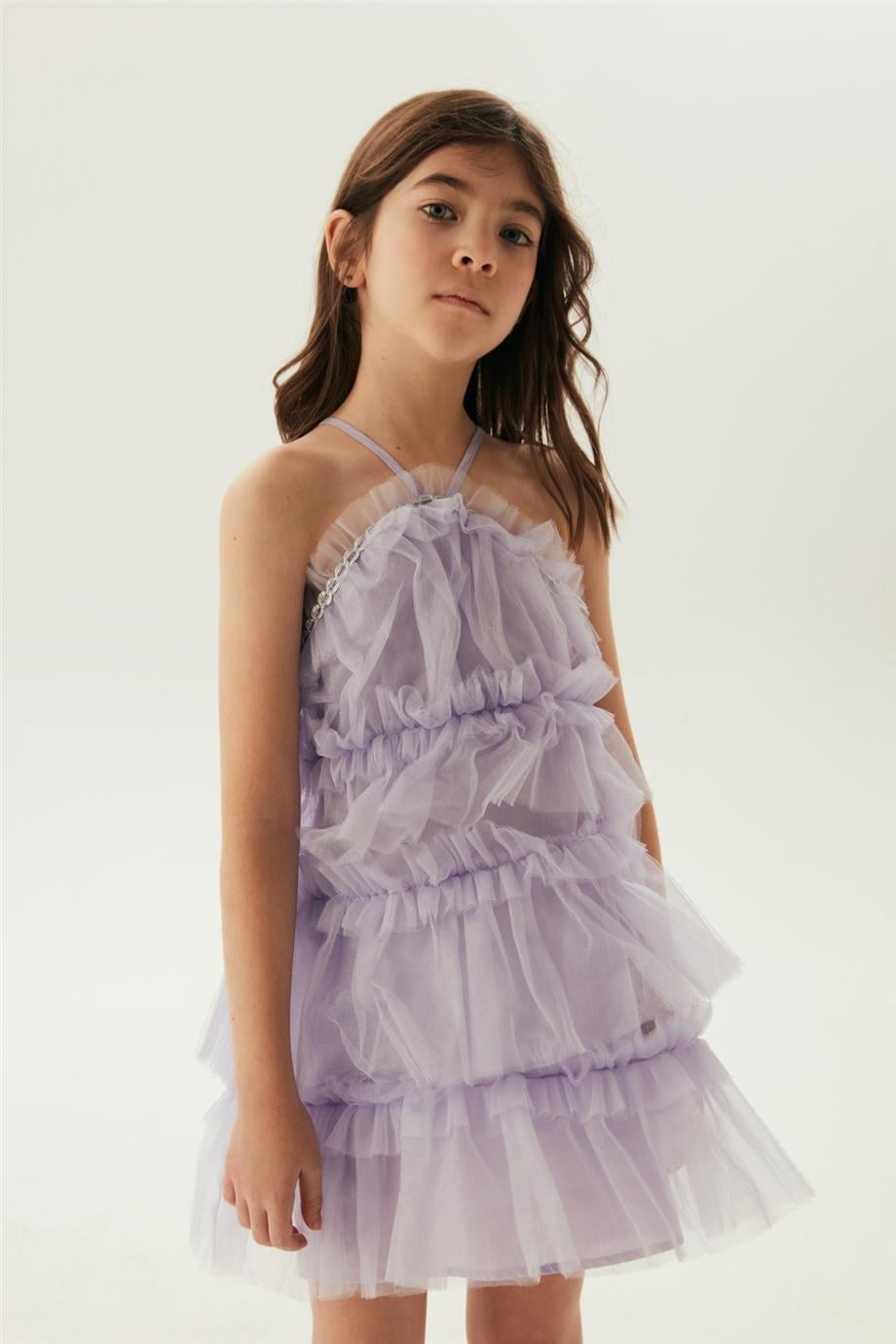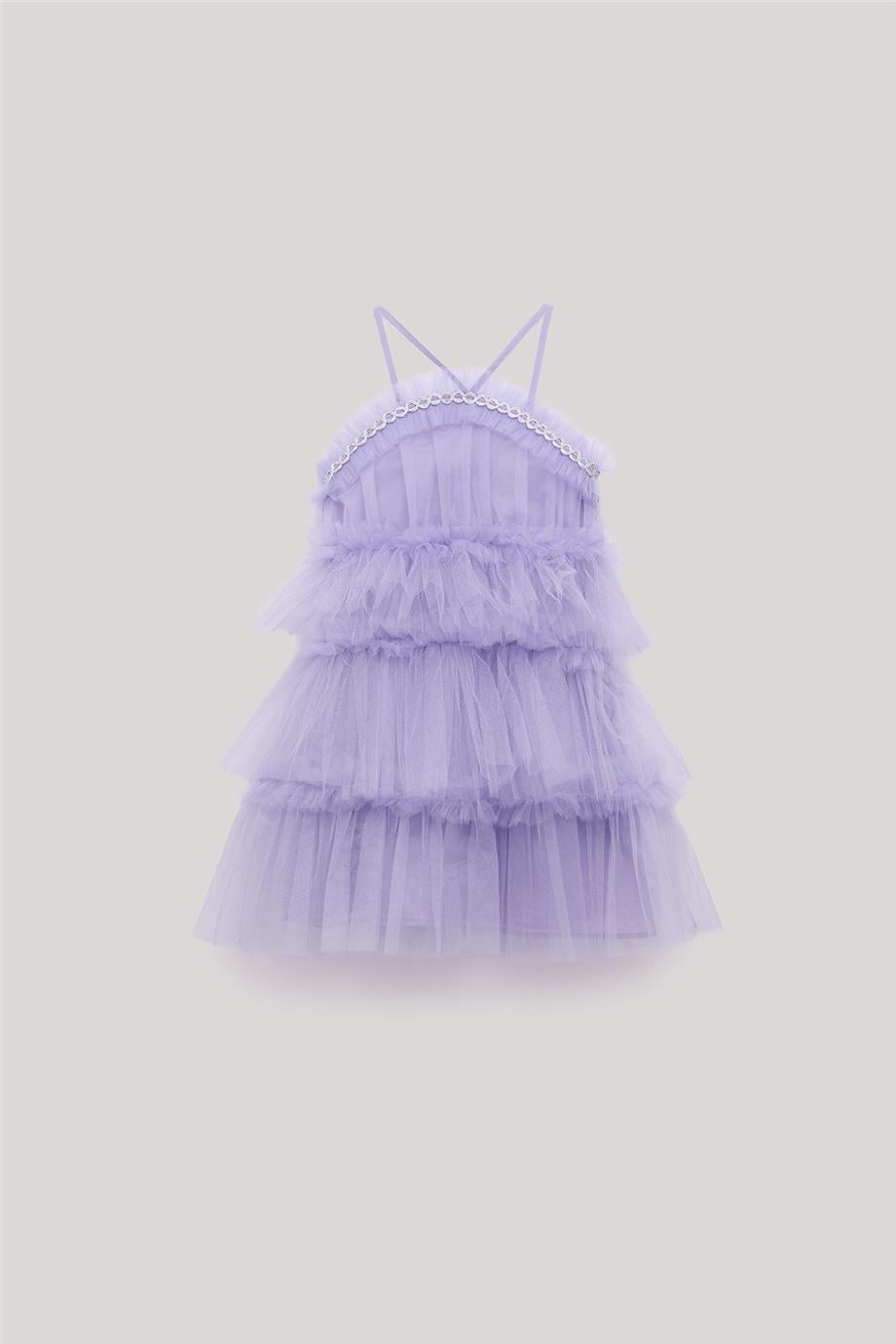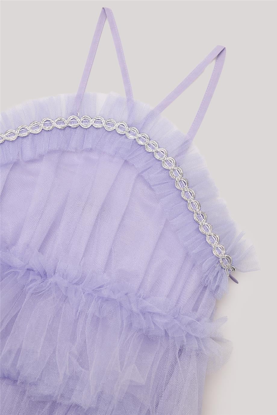 Kız Çocuk Lila Elbise – %100 Pamuk – Yaka : Fırfır Yaka Kol : Askılı Kalıp : Geniş Kumaş : Tül Astar : Dokuma Cep : Cepsiz