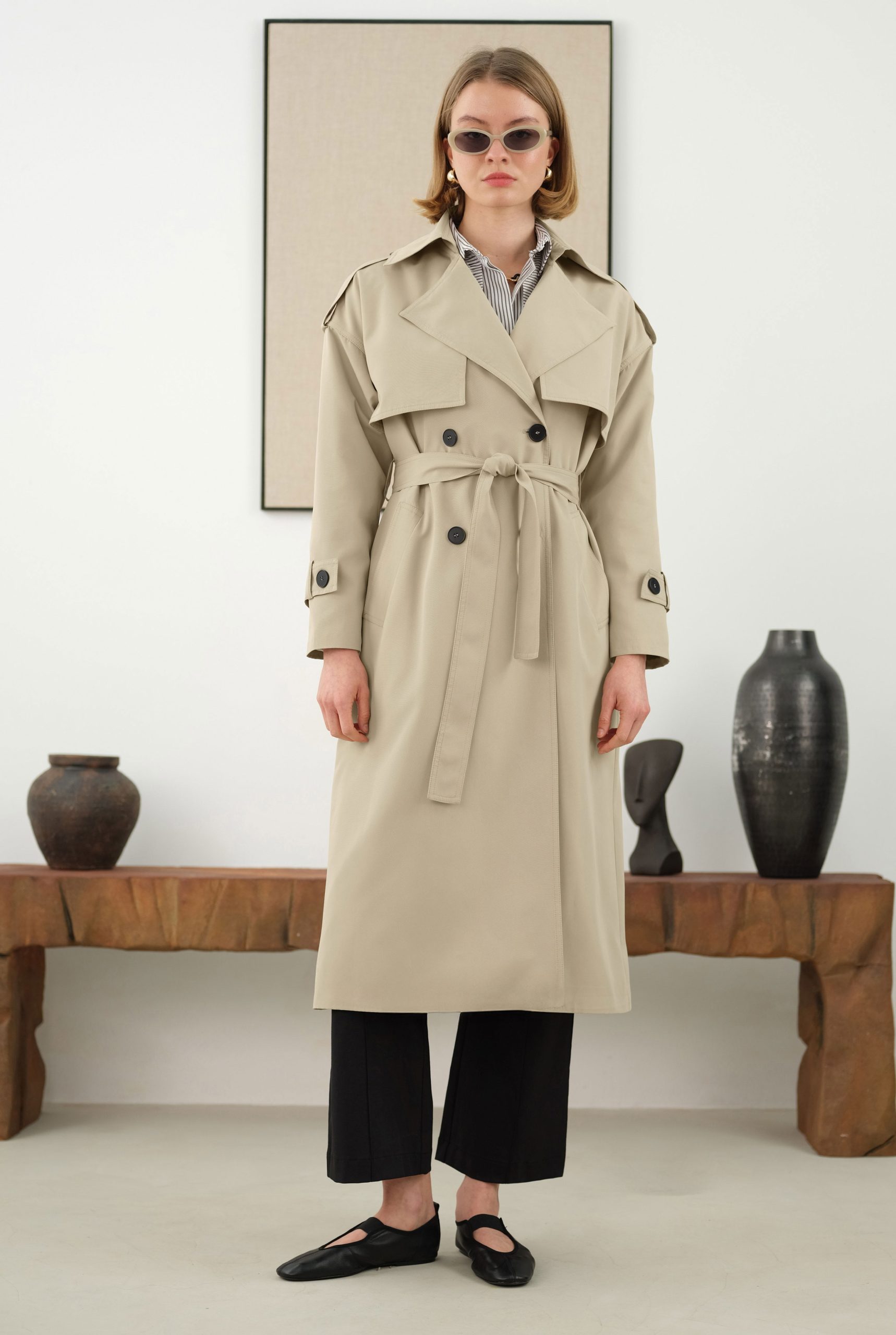 Uzun Klasik Trençkot Adaçayı Yeşili