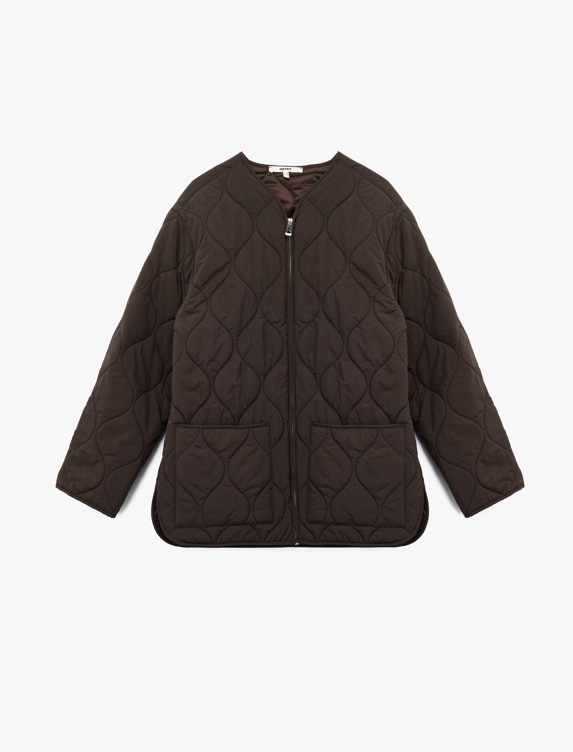 Uzun Kollu Cepli Bisiklet Yaka Fermuarlı Oversize Kapitone Ceket