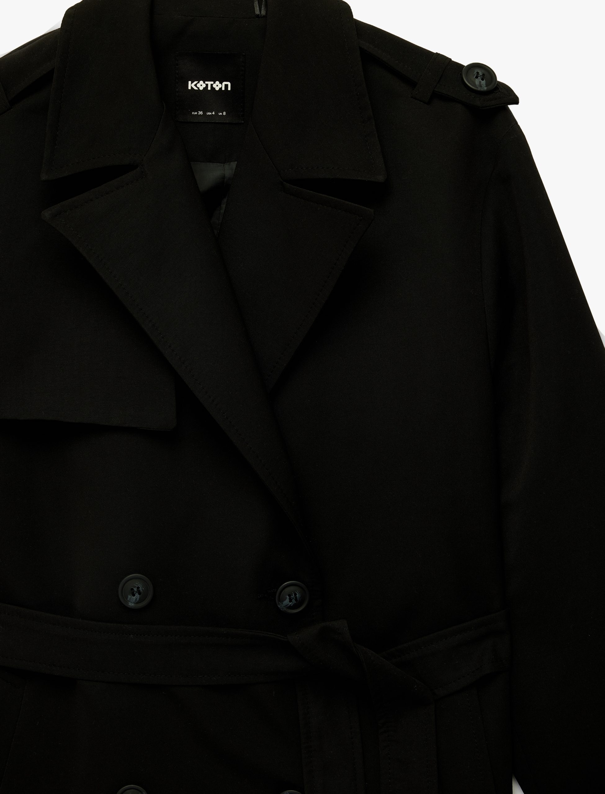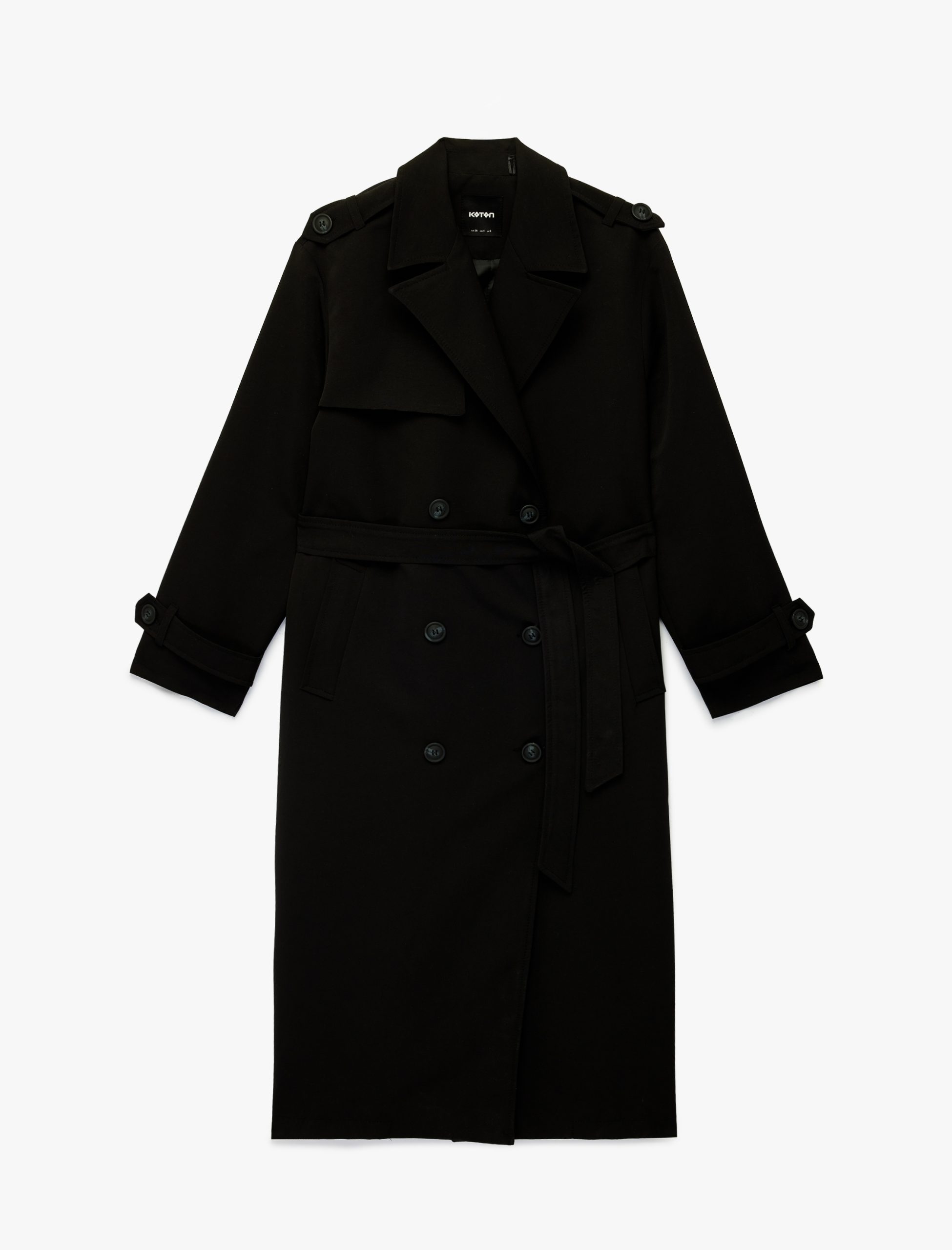 Uzun Kollu Düğmeli Cepli Kemerli Kruvaze Gabardin Trençkot