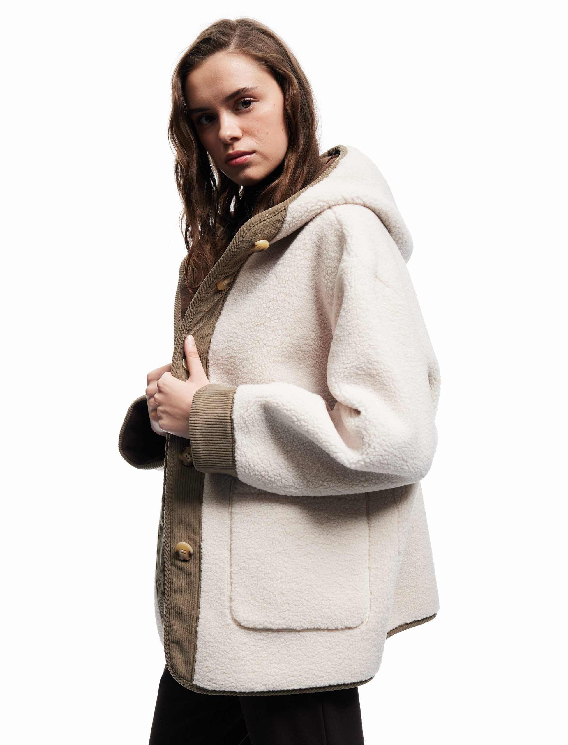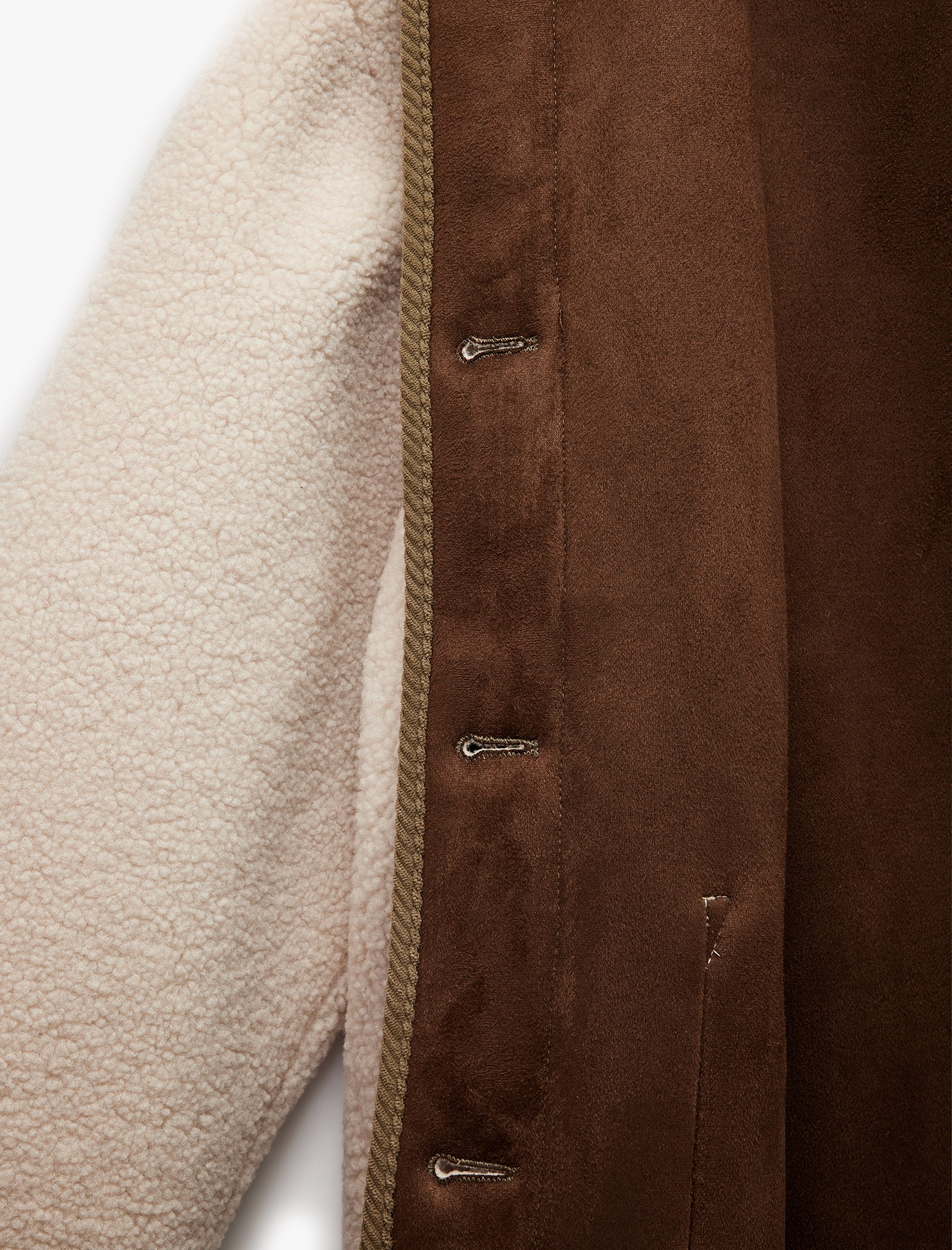 Uzun Kollu Kapüşonlu Süet Astarlı Cepli Düğmeli Peluş Kaban