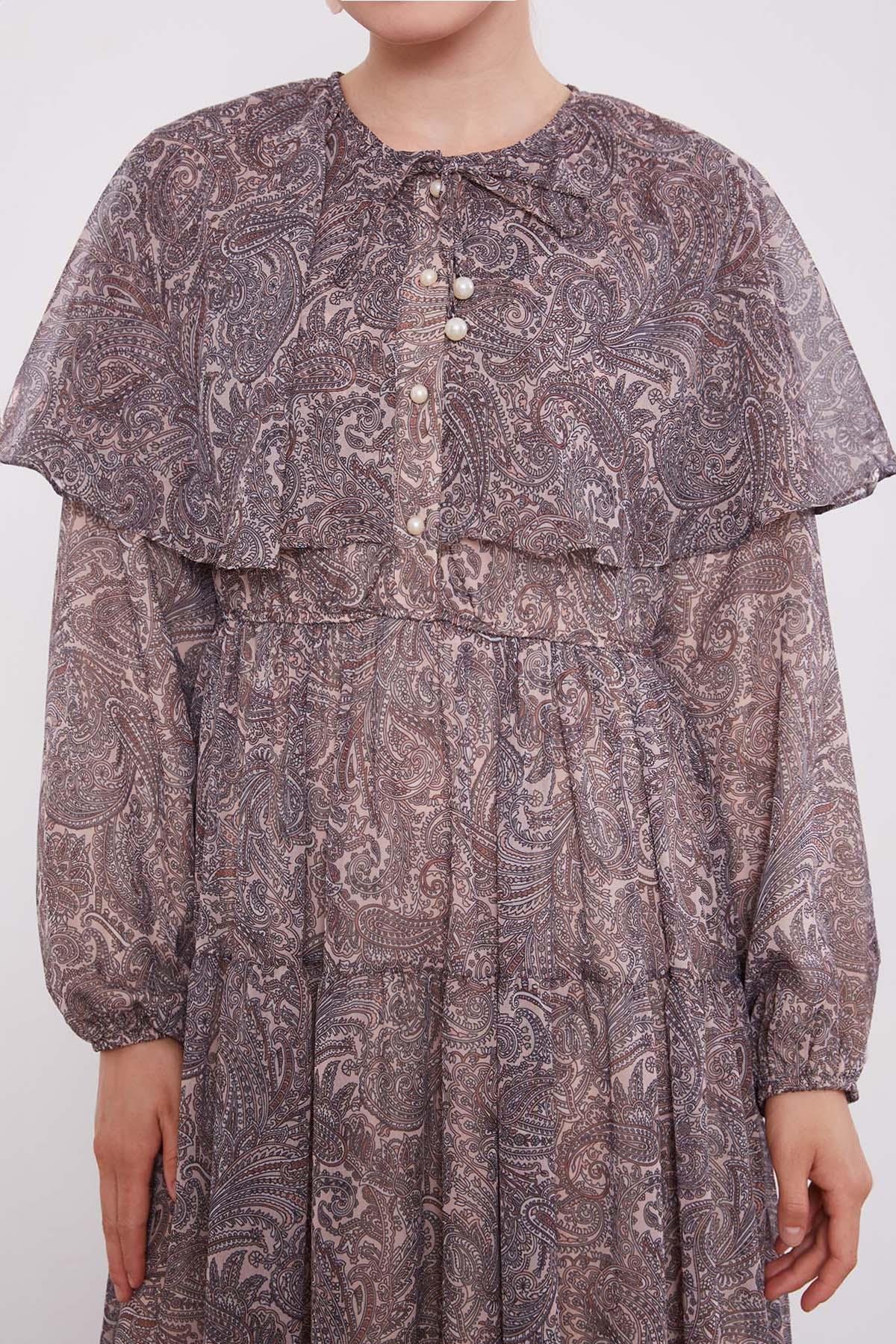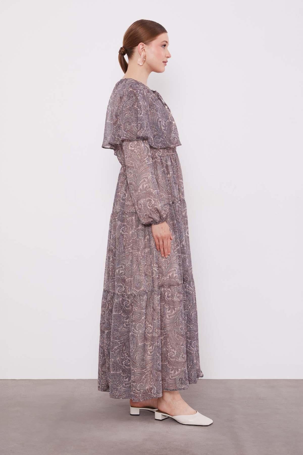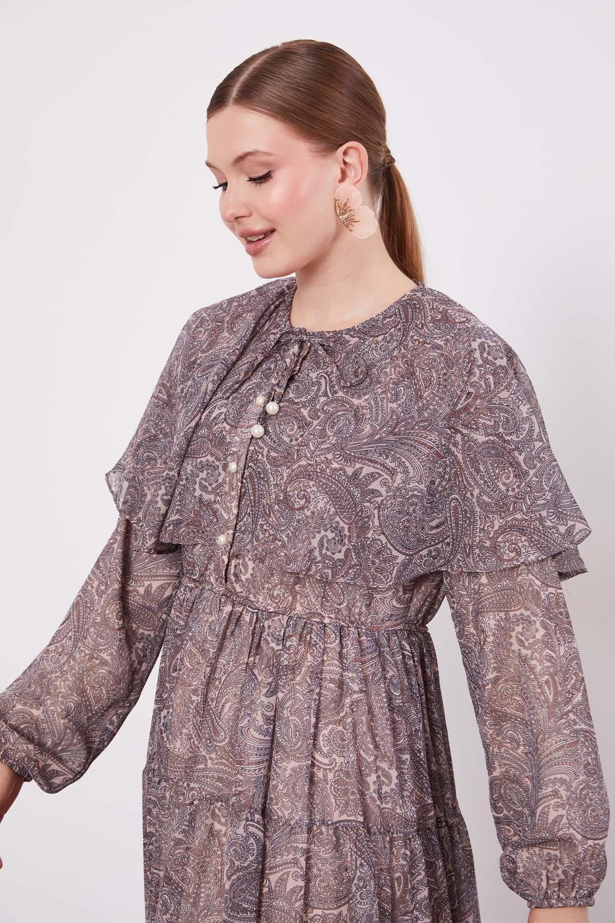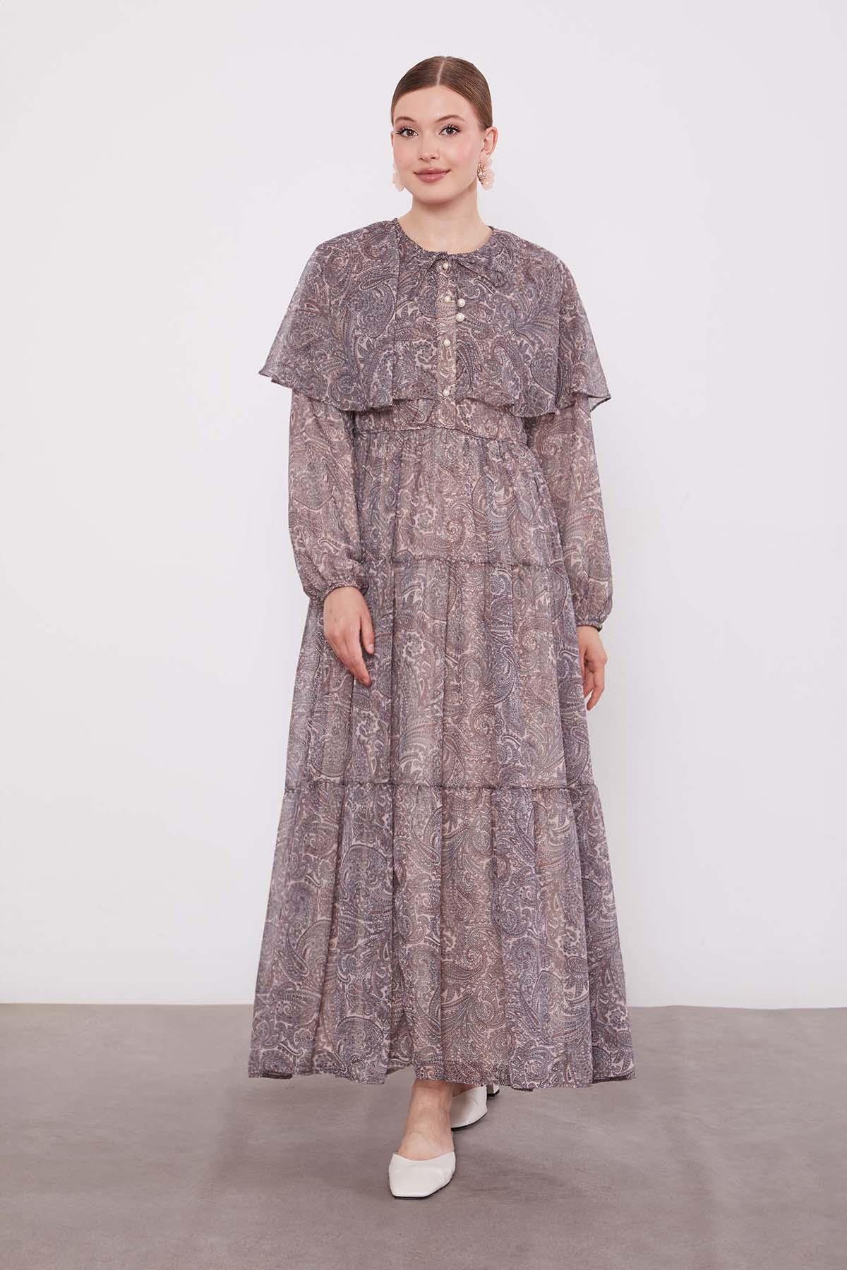 Etnik desenli şifon elbisenin omuzlarındaki mini şifon pelerin her ortamda ihtişam katarken, büzgülü ve katlı etek kısmı tasarıma olağanüstü bir görünüm kazandırıyor. Lastikli fırfırlı kollara sahip bu hafif elbise, yumuşak dokusuyla cildinize ferahlık hissi veriyor. Vücut hatlarınızı abartılı şekilde belli etmeden, hem sade hem de dikkat çekici bir siluet sunan bu şifon elbise, şıklığınızı tamamlıyor.