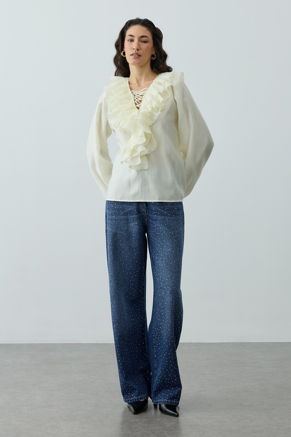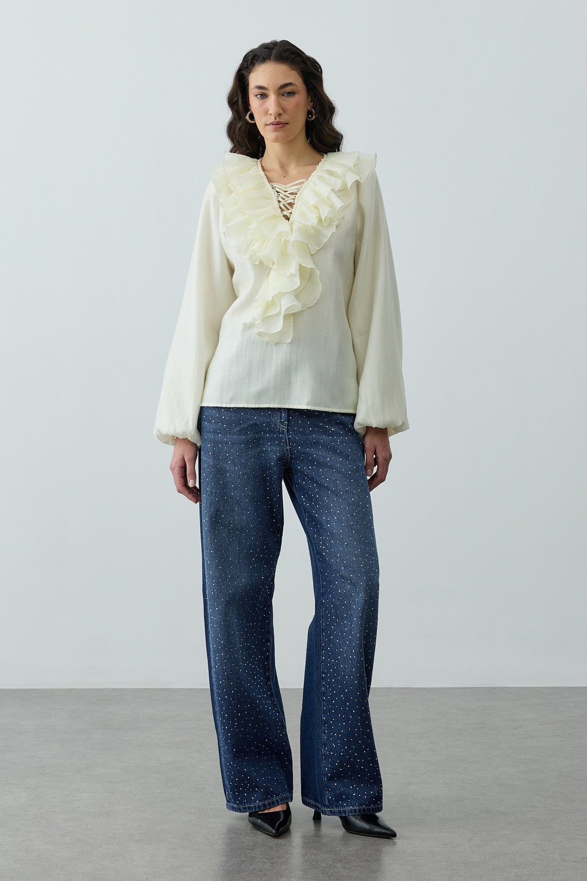 Liyosel karışımlı dokuma kumaştan, önü britli köprülü, % 100 pamuk astarlı, önü volanlı, uzun kollu gömlek.