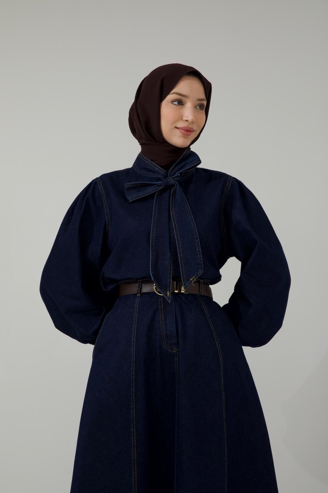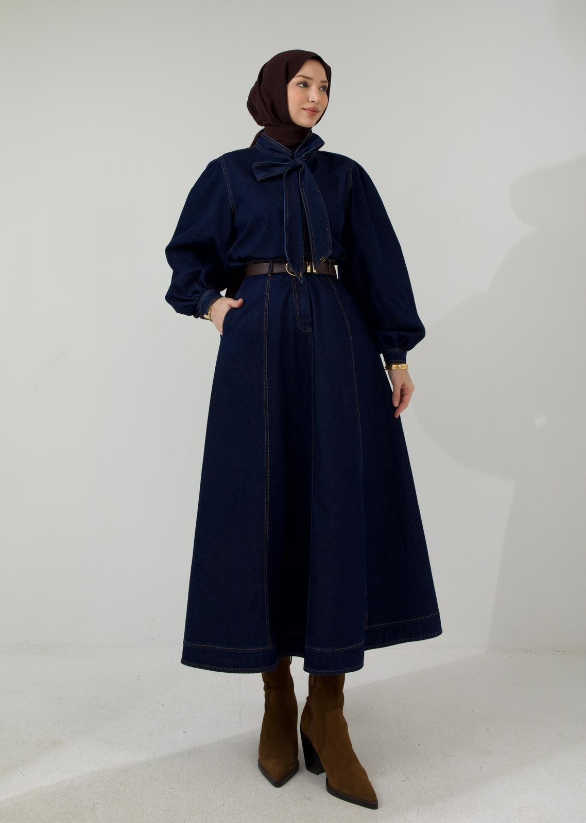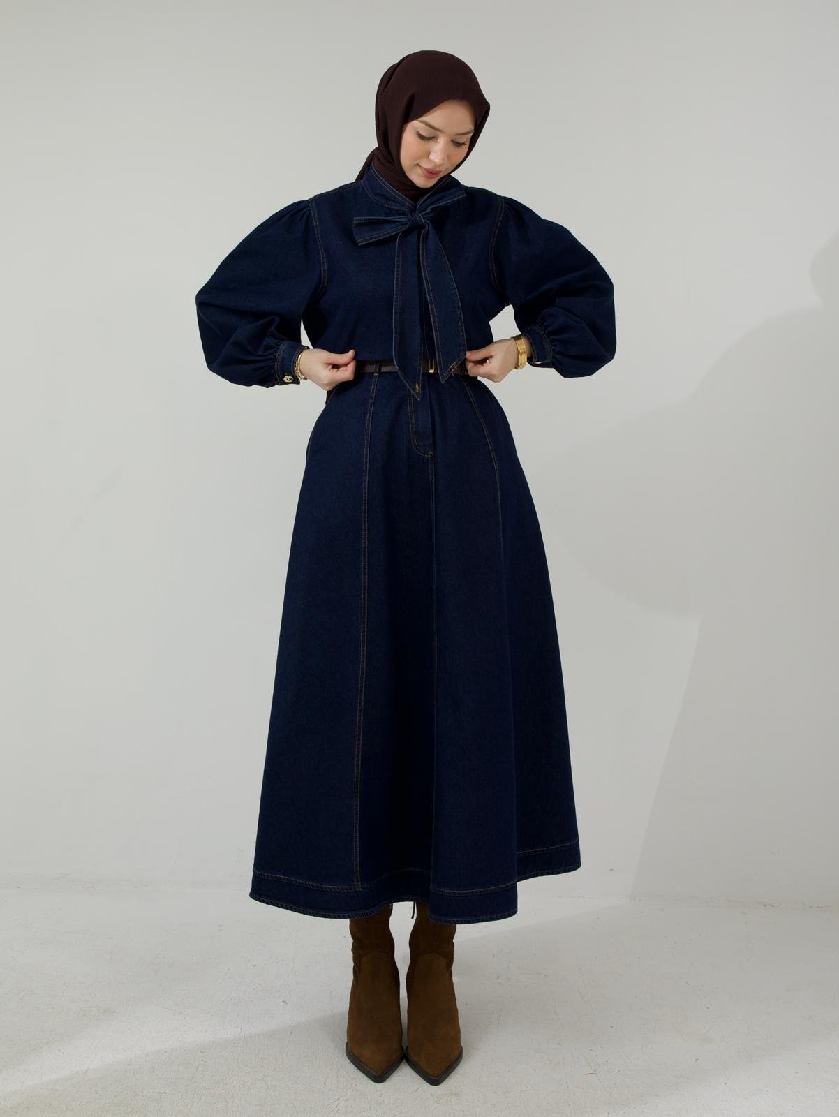Yaka Bağcıklı Koyu Lacivert Denim Takım