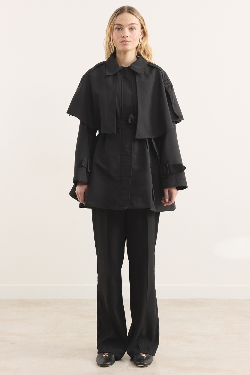 Yaka Detay Kol Kemerli Kısa Trençkot – Siyah