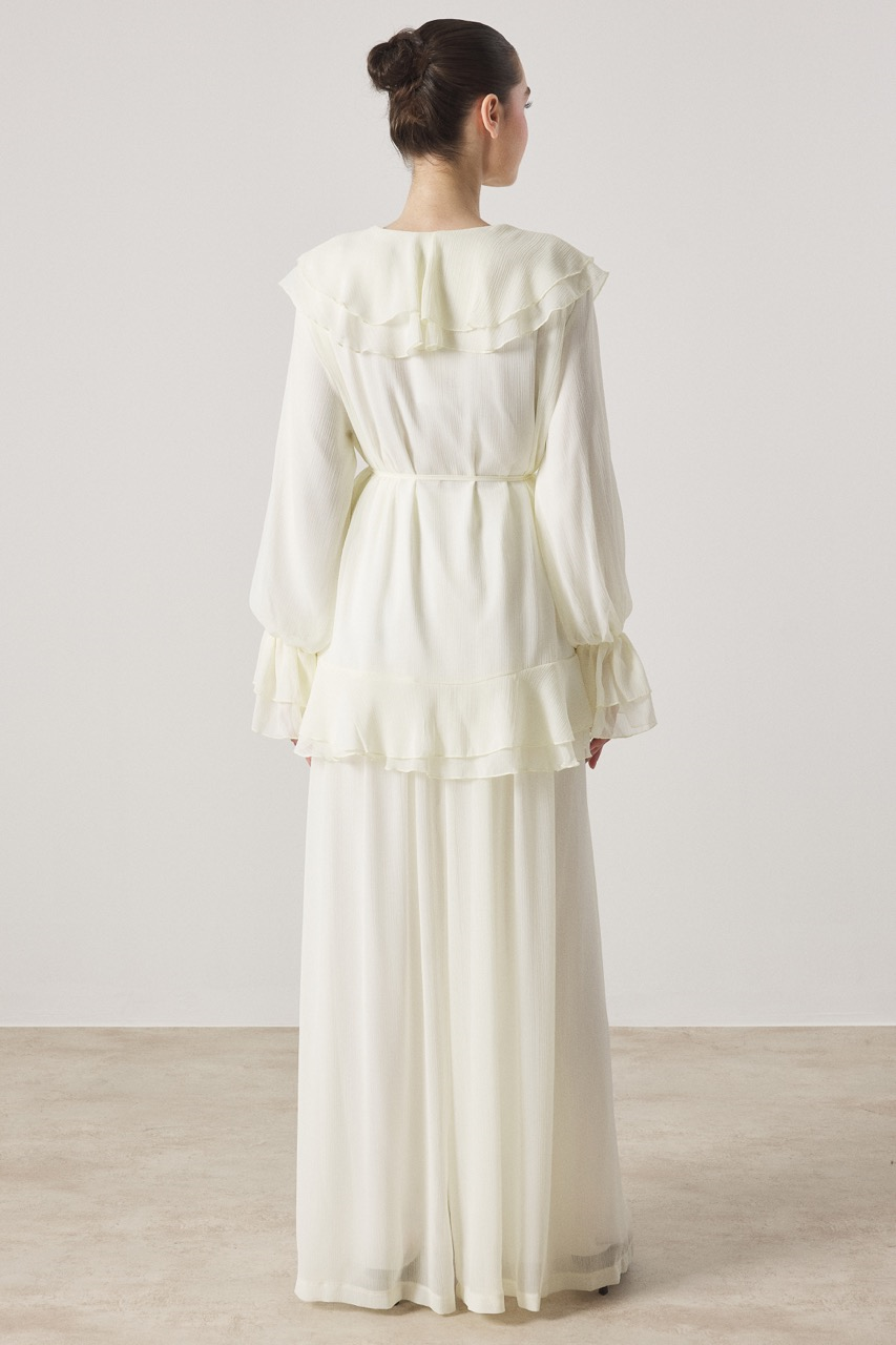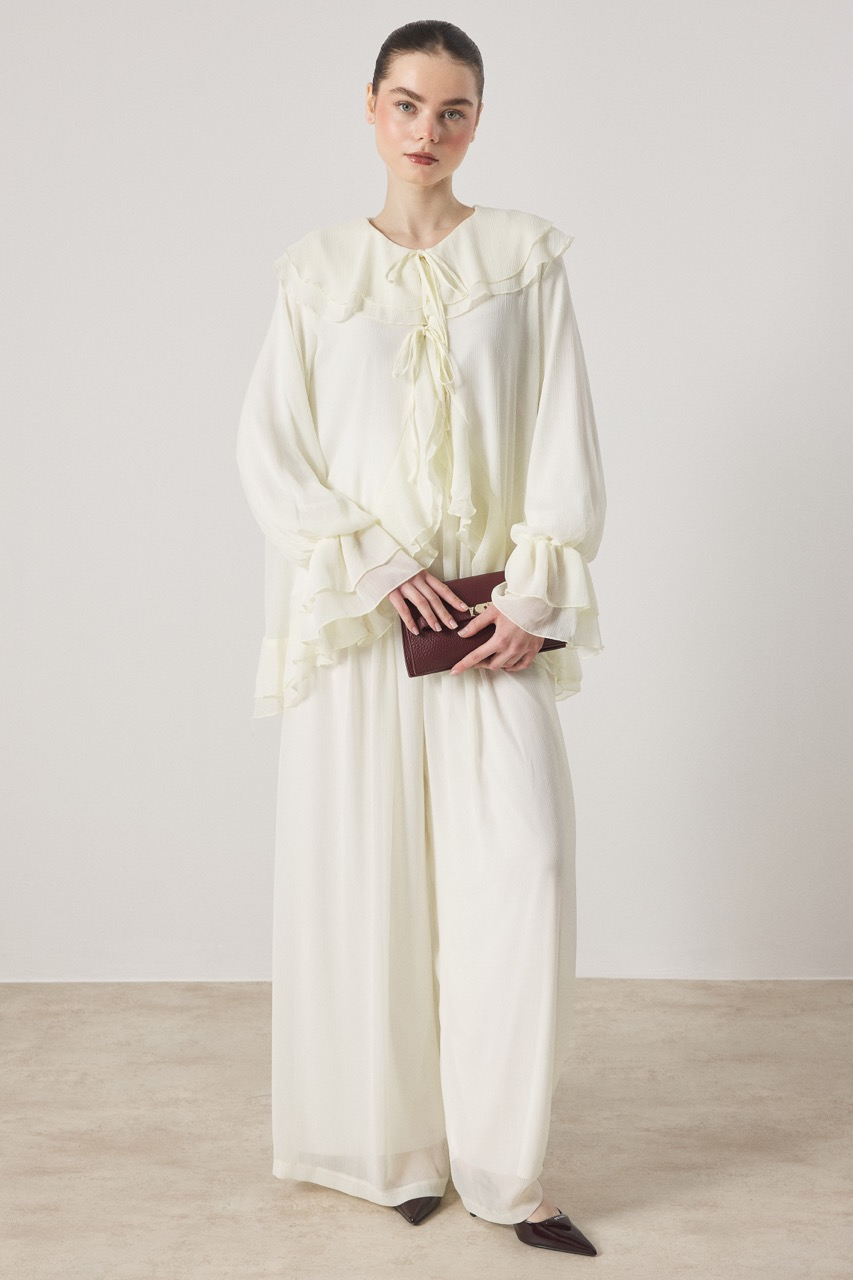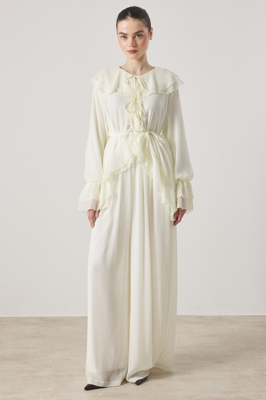 Yaka ve Kol Volanlı Şifon Takım – Krem