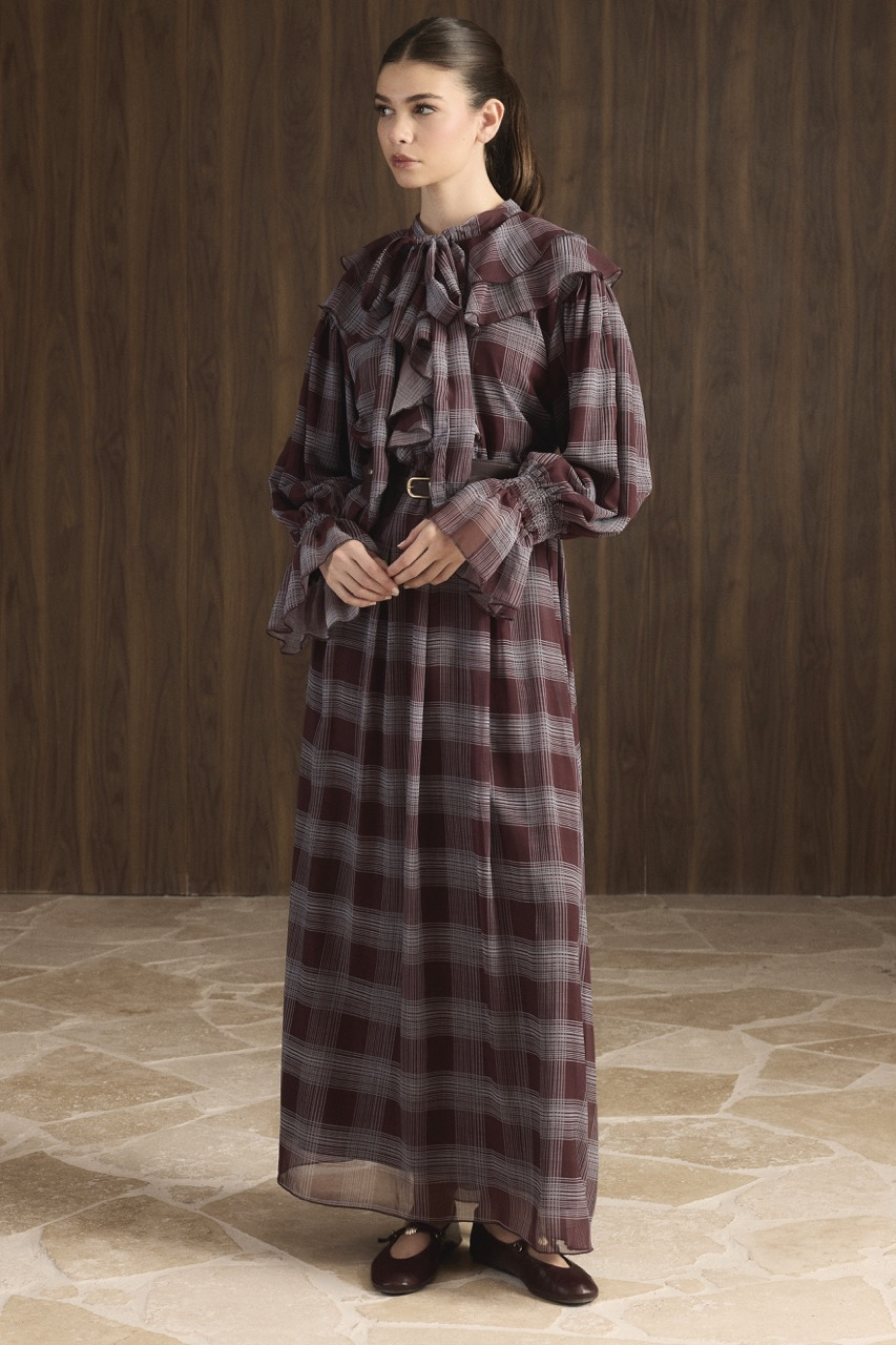 Yaka Volanlı Ekose Şifon Elbise – Bordo
