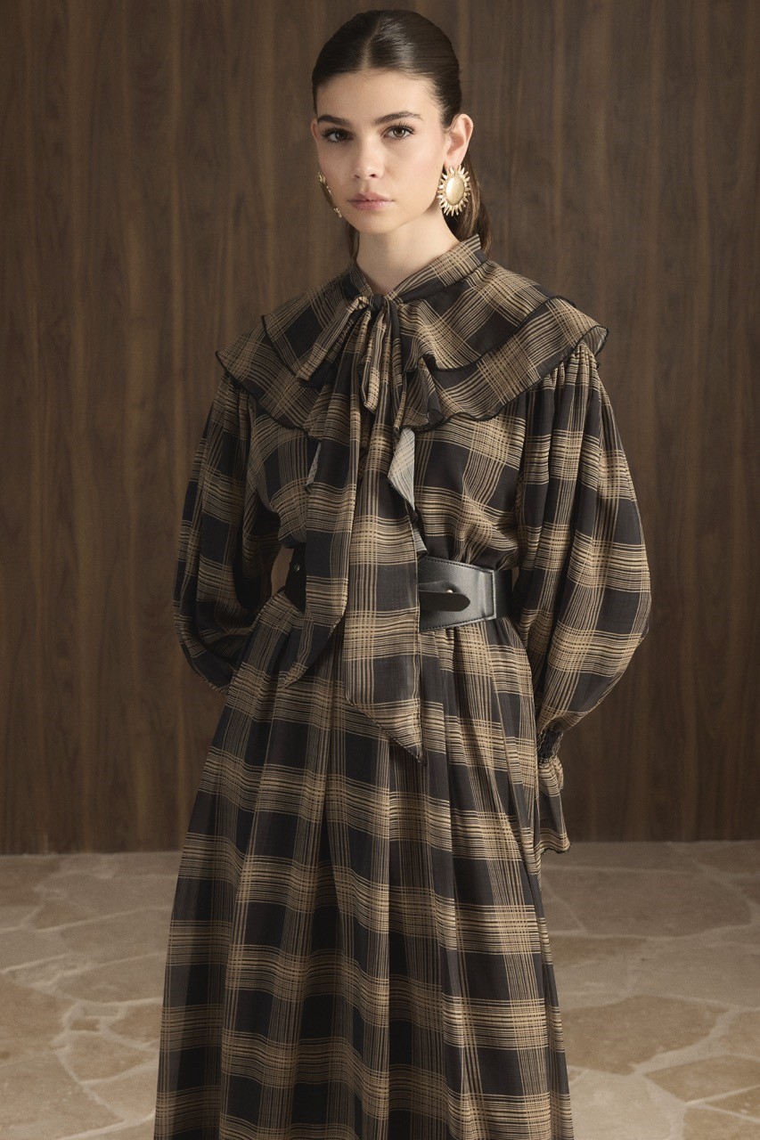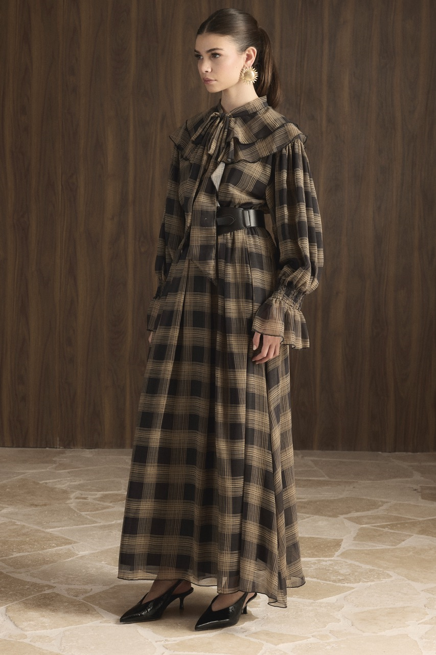 Yaka Volanlı Ekose Şifon Elbise – Siyah