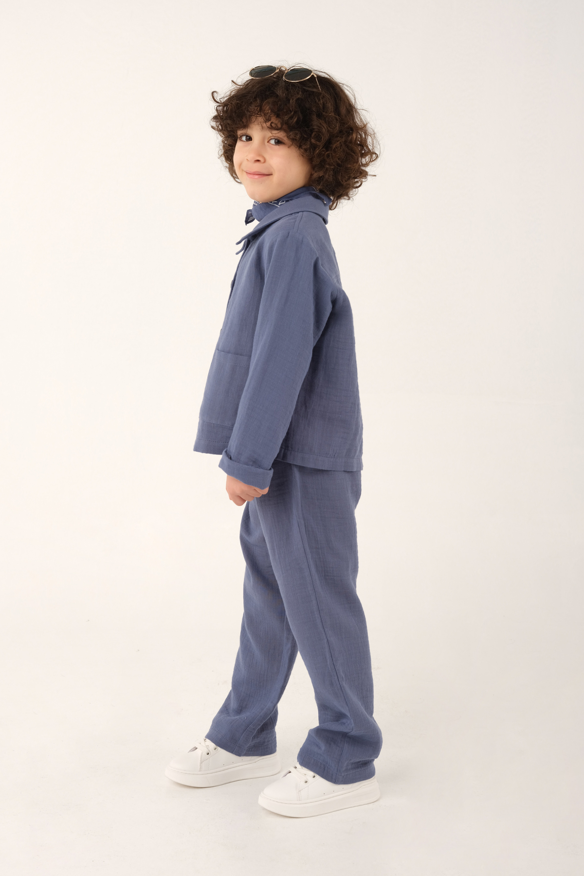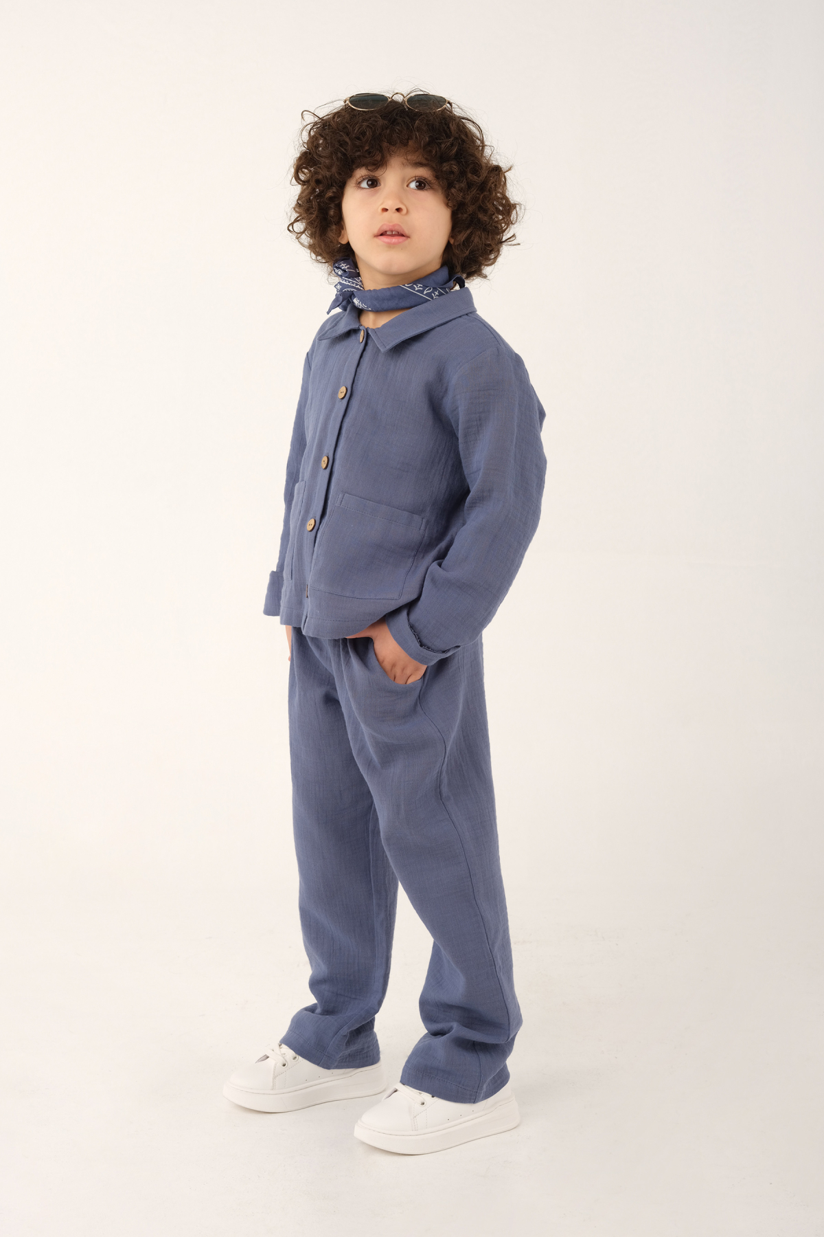 %100 Pamuk müslin kumaştan üretilmiş takım.Gömlek, yakalı, önü düğmeli, iki adet torba cepli. Pantolon beli lastikli, yan cepli. Ürünlerimiz bol kalıplara sahiptir. Mankendeki gibi bir duruş için tam yaş aralığını tercih edebilirsiniz. 1-2 Yaş: Gömlek arka ortadan uzunluk : 36 cm Pantolon boyu: 50 cm 2-3 Yaş: Gömlek arka ortadan uzunluk : 37 cm Pantolon boyu: 54 cm 3-4 Yaş: Gömlek arka ortadan uzunluk : 38 cm Pantolon boyu: 58 cm 4-5 Yaş: Gömlek arka ortadan uzunluk : 40 cm Pantolon boyu: 62 cm 5-6 Yaş: Gömlek arka ortadan uzunluk : 41 cm Pantolon boyu: 66 cm 7-8 Yaş: Gömlek arka ortadan uzunluk : 44 cm Pantolon boyu: 74cm