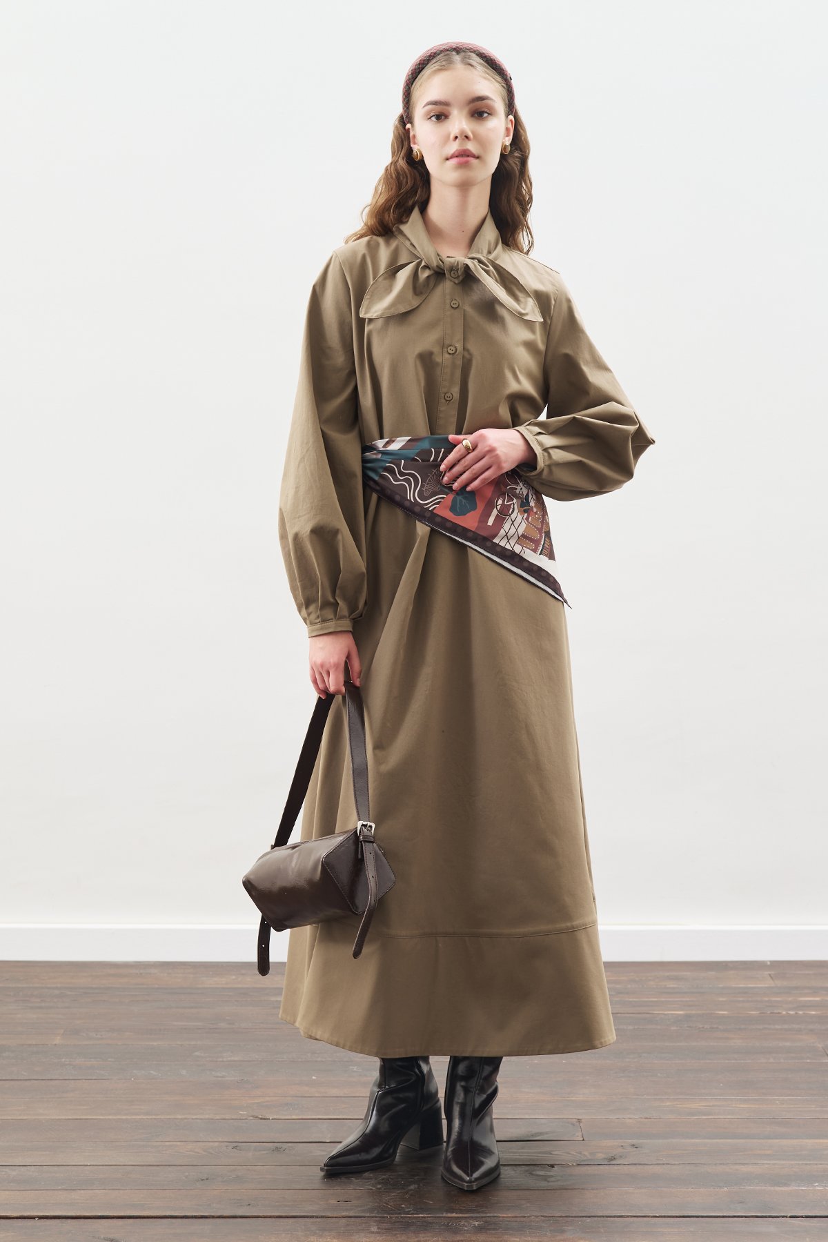 YAKASI BAĞLAMA DETAYLI ELBİSE HAKİ