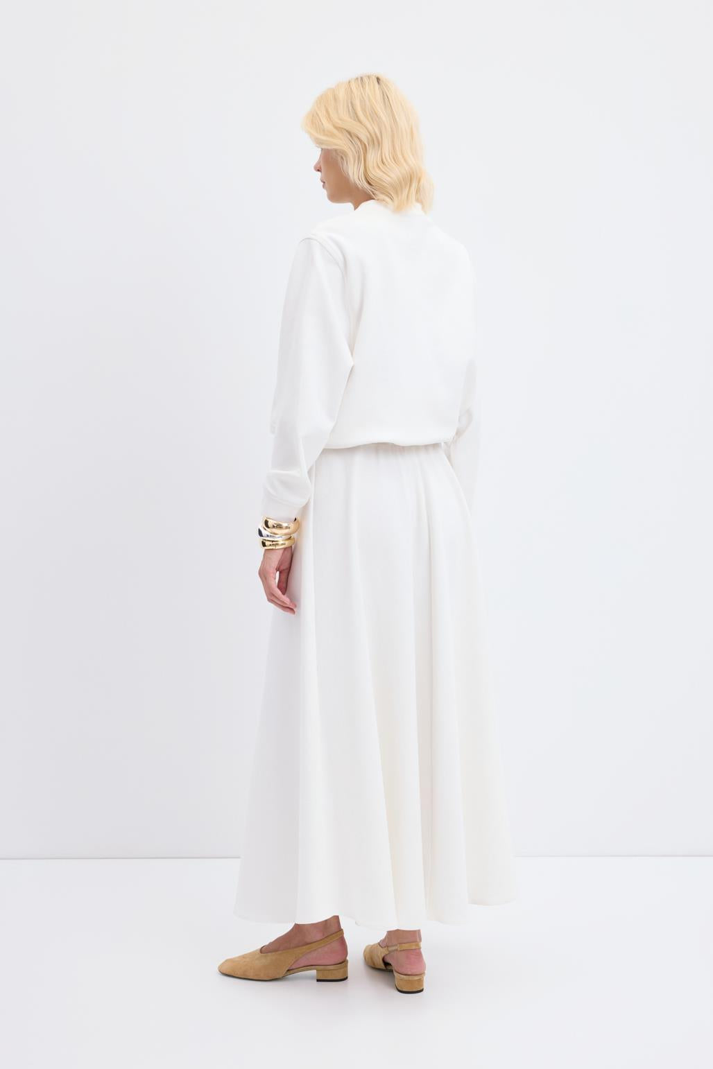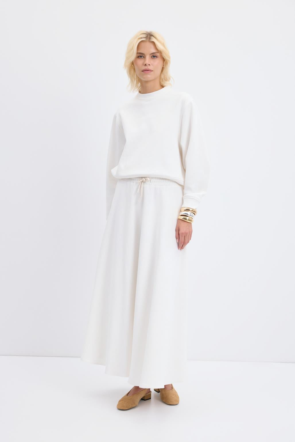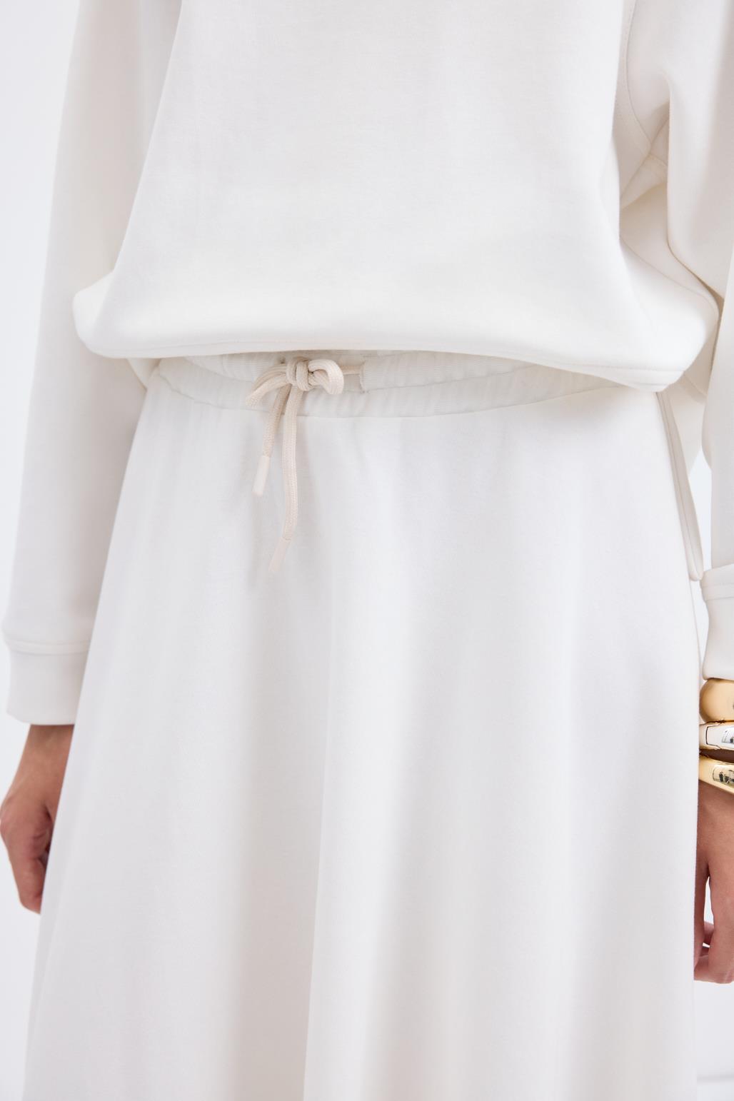 Yüksek Bel Bağcıklı Geniş Form Kloş Etek Ekru, çift taraflı interlok kumaştan üretilmiş, rahat ve şık bir parçadır. Tam tur lastikli yüksek beli ve ayarlanabilir bağcık detayı konforlu kullanım sağlar. Geniş form ve kloş kesimi hareket özgürlüğünü artırırken, şık duruşuyla günlük ve özel kombinlerinizi tamamlar. Gardırobunuzda hem rahat hem zarif bir seçenek olarak yer alacak.