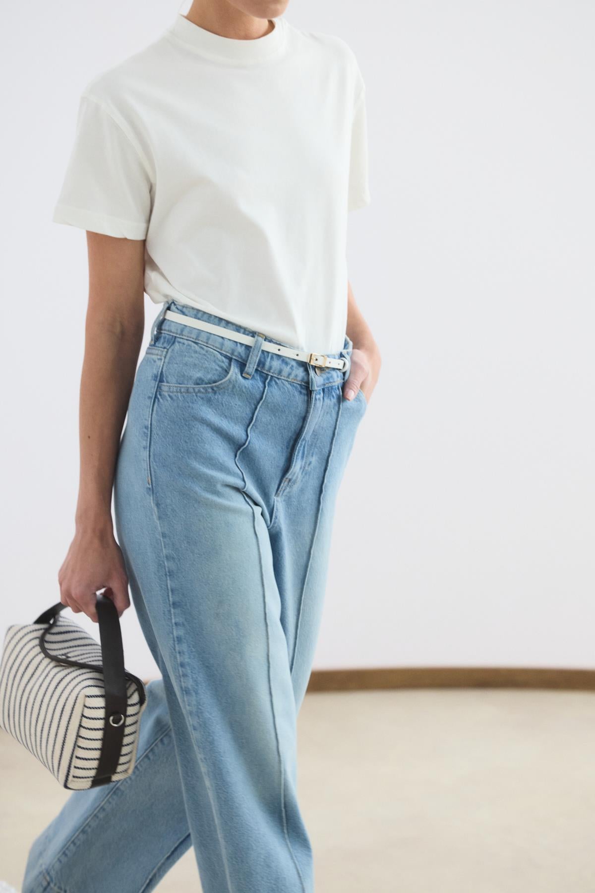 Yüksek Bel Çimalı Geniş Paça Kot Pantolon Açık Mavi