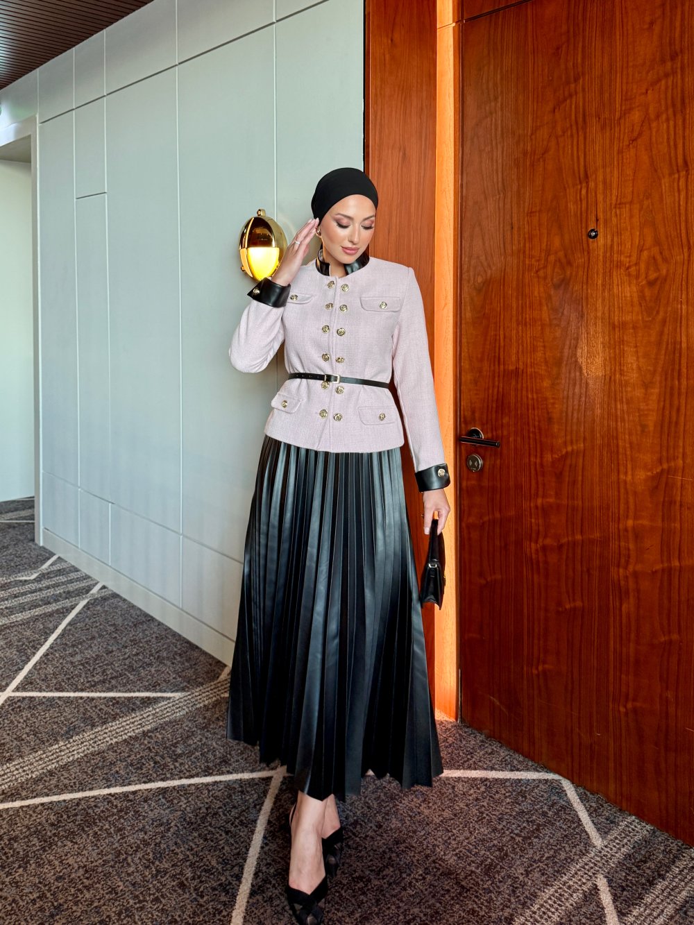 Ceket, birinci sınıf Channel kumaştan yapılmıştır ve etek deri kumaştan üretilmiştir. Ceket tam boy düğmelidir. Ceket, deri detaylara sahiptir. Cekette omuz pedleri bulunmaktadır. Ceket astarlıdır. Ceket, bir kemer içermektedir. Eteğin beli fermuarlıdır. Etek pililidir. Ceket uzunluğu 62 cm, omuz 36 cm, göğüs 49 cm. Etek uzunluğu 95 cm, bel 36 cm.