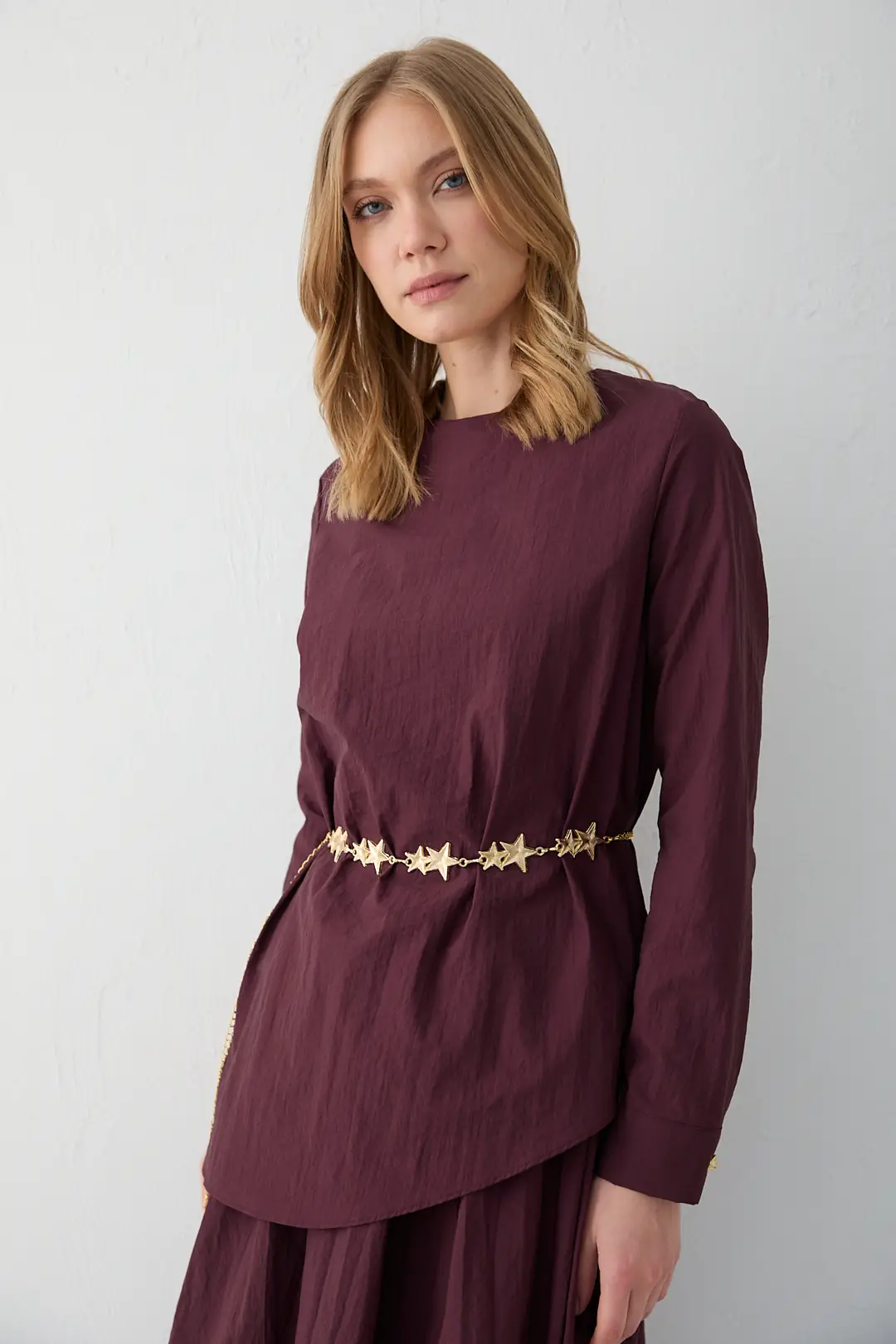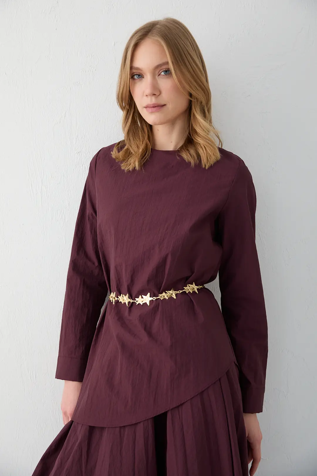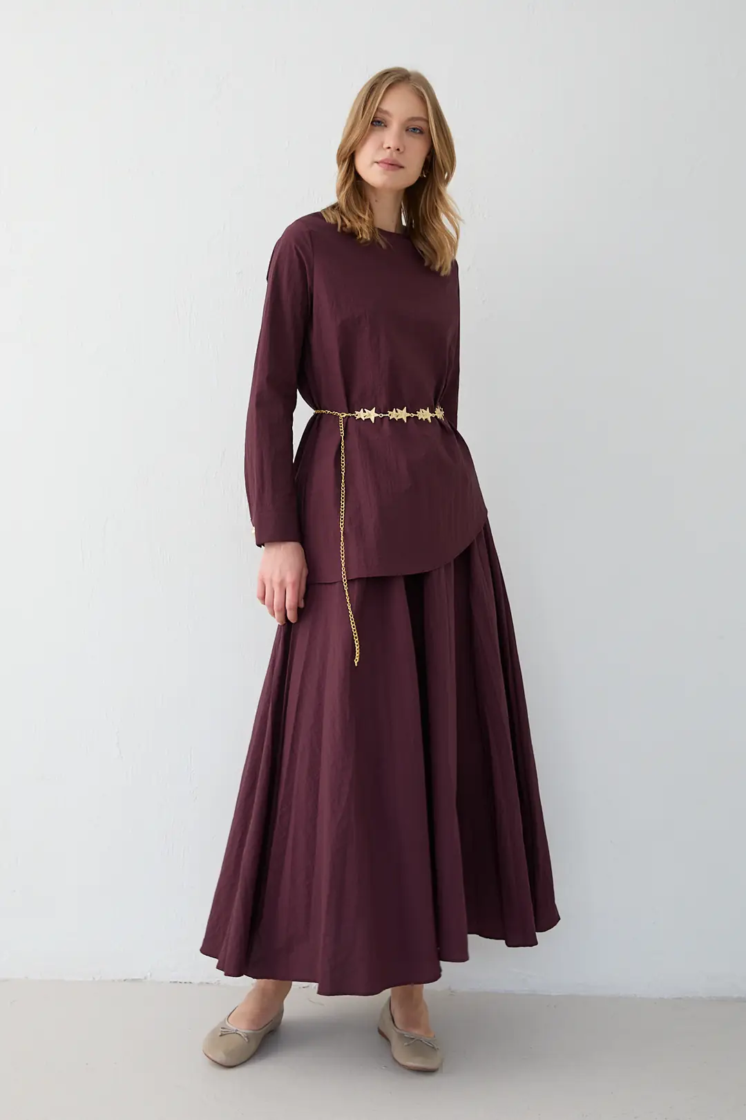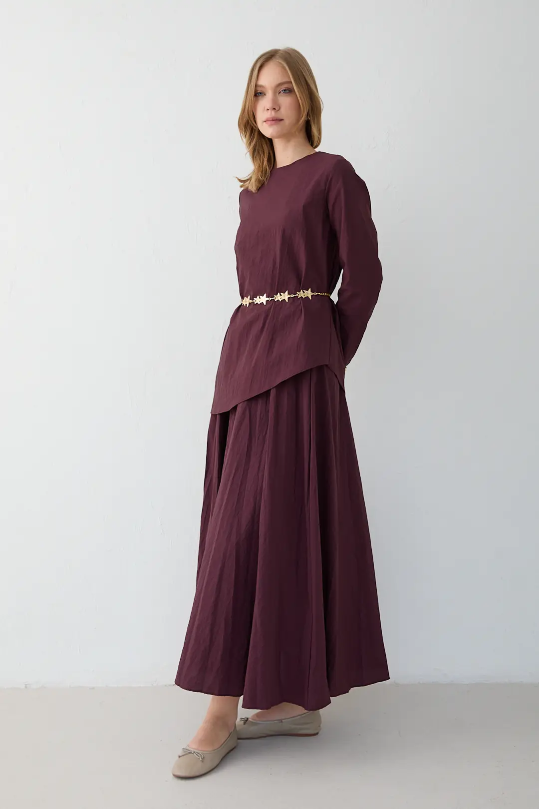 Bisiklet yaka tasarımı ve yaka arkasındaki 43 cm fermuar detayıyla modern bir duruş sunan takım, asimetrik kesimli etek ucu ile hareketli bir siluet oluşturur. Kol ucu düğme detayı ve seyyar zincir kemeri modele şık bir tamamlayıcılık katarken, lastikli etek beli konforlu bir kullanım sağlar. Cupra kumaşın akıcı ve yumuşak yapısı sayesinde zarif ve rahat bir görünüm elde edilir.